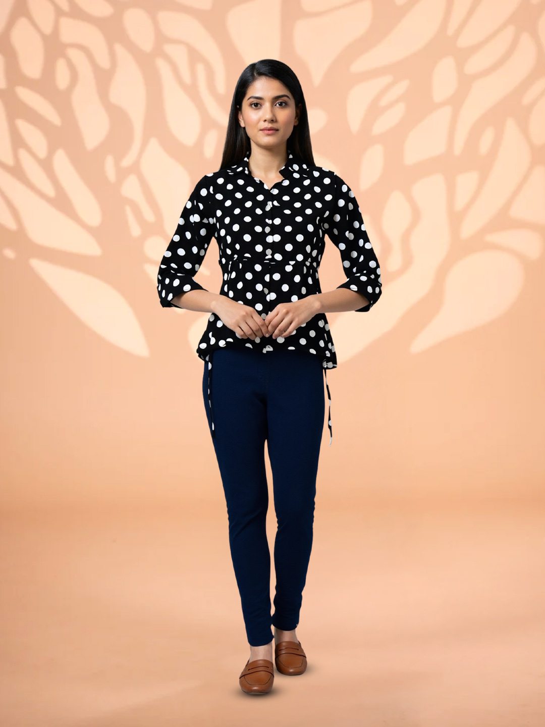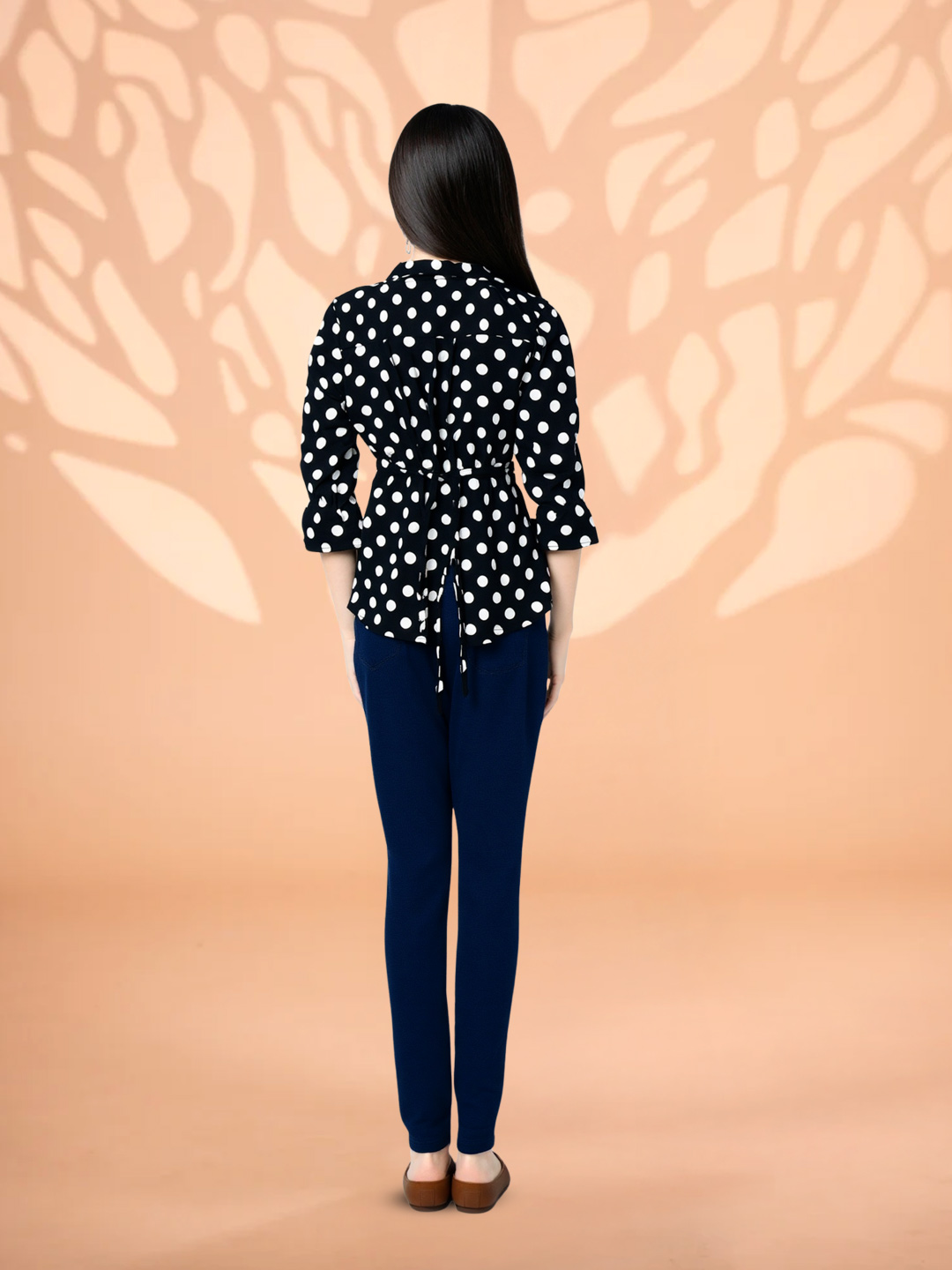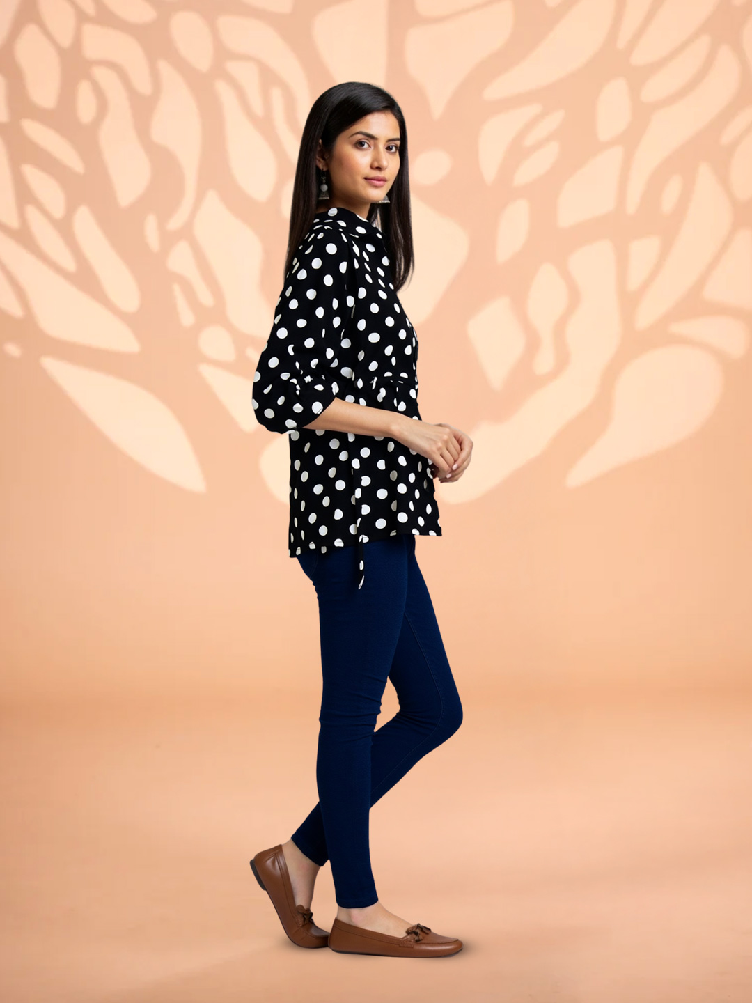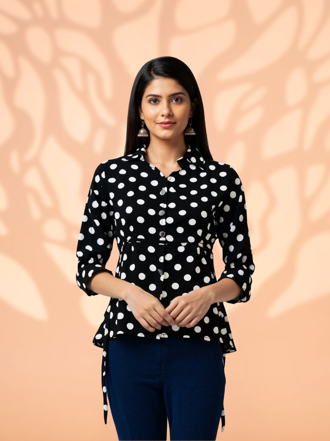 Featuring a classic black base adorned with crisp white polka dots, this top delivers a look that never goes out of style. The iconic print adds playful elegance while remaining effortlessly chic.