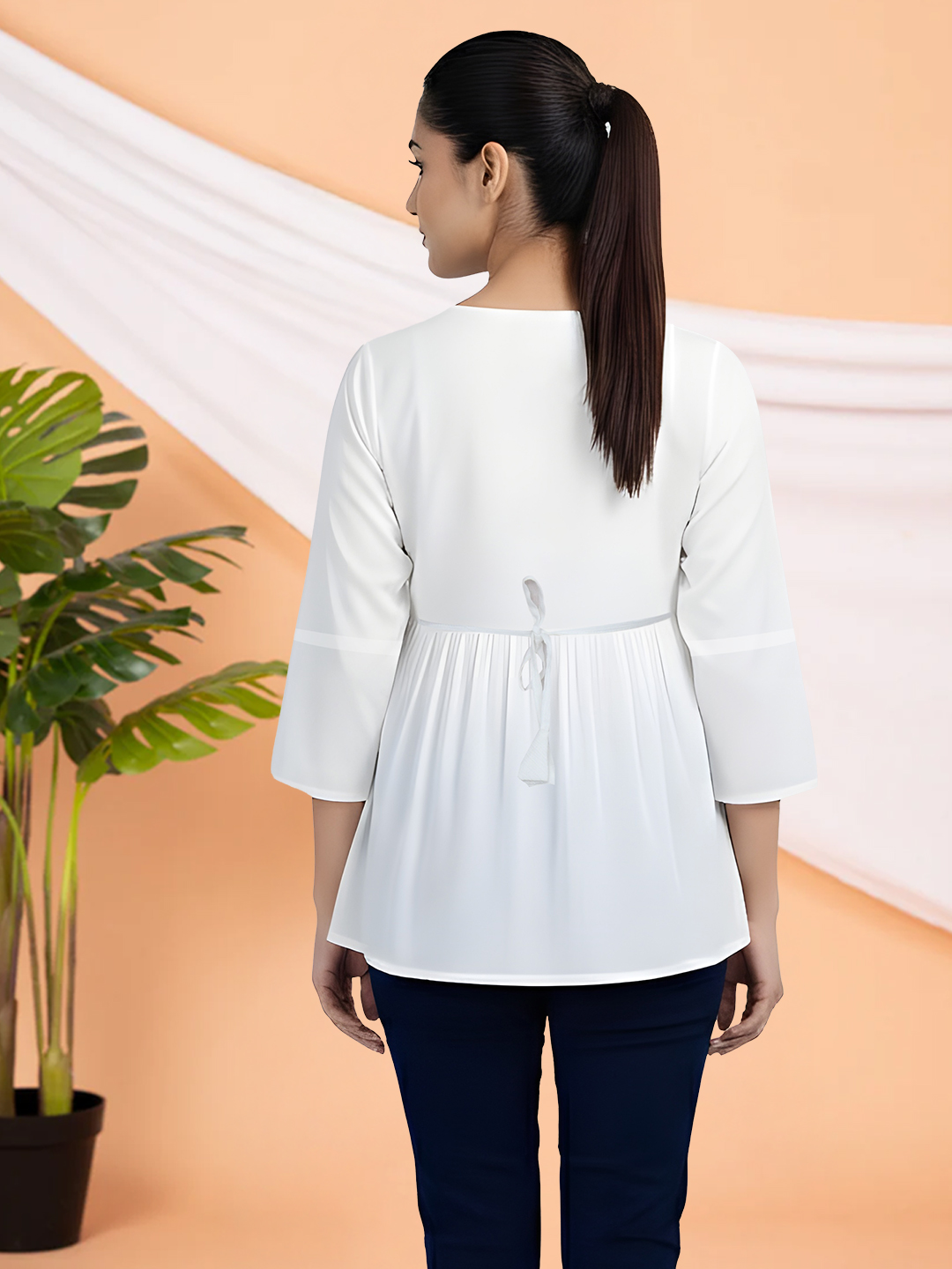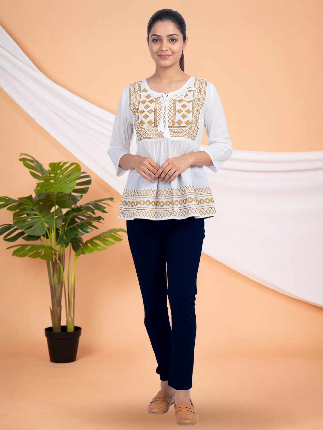 Designed with a delicate tie-up neckline, this tunic brings a soft, graceful touch to your ethnic wardrobe. The subtle detailing enhances its appeal while allowing easy styling for both casual and semi-formal looks.