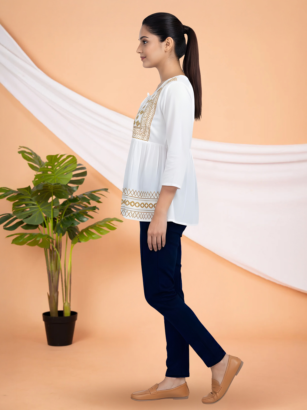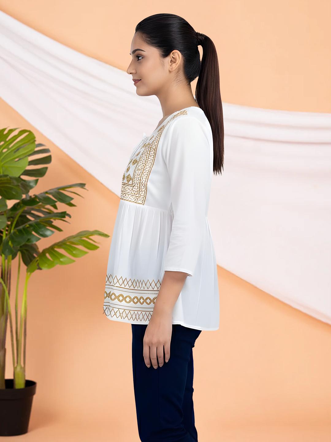 This women’s ethnic tunic top features a beautifully embroidered yoke that highlights traditional craftsmanship with a modern sensibility. The intricate motifs add depth and character, making it a standout piece for everyday elegance.