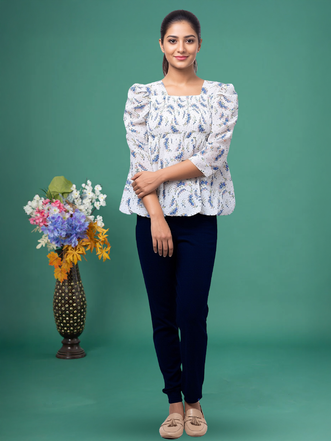 This floral print top blends comfort with style beautifully. The square neckline adds a modern edge, while the long puff sleeves enhance its elegant appeal. Crafted for comfort, it’s an ideal choice for casual outings or relaxed gatherings.