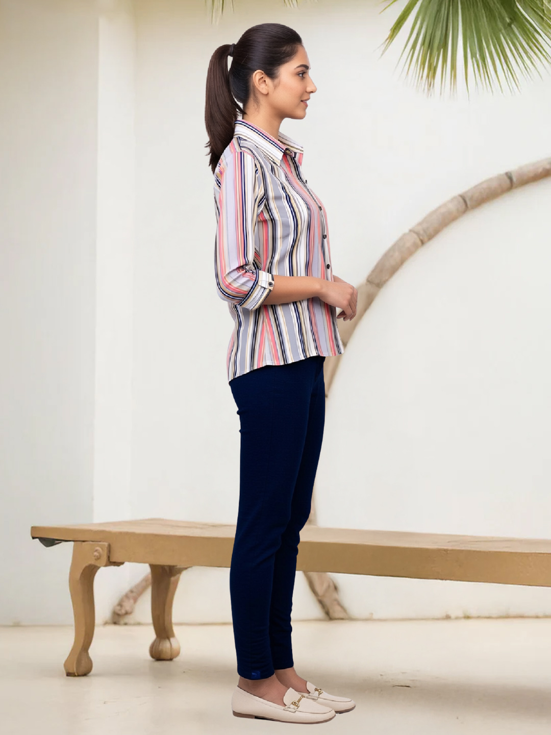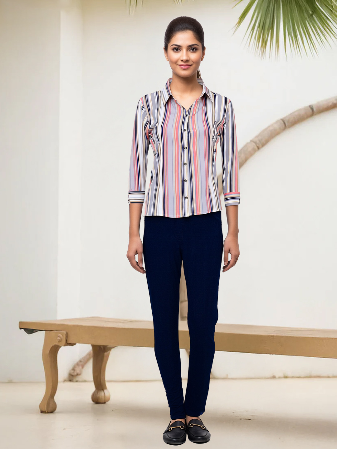Designed for everyday elegance, this women’s shirt comes in a vertical striped print with a regular fit that flatters naturally. The front button-down closure adds a clean, structured finish ideal for smart casual styling.