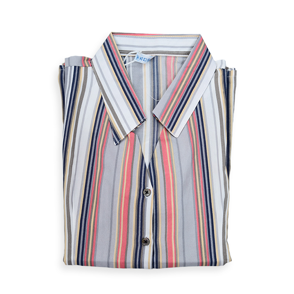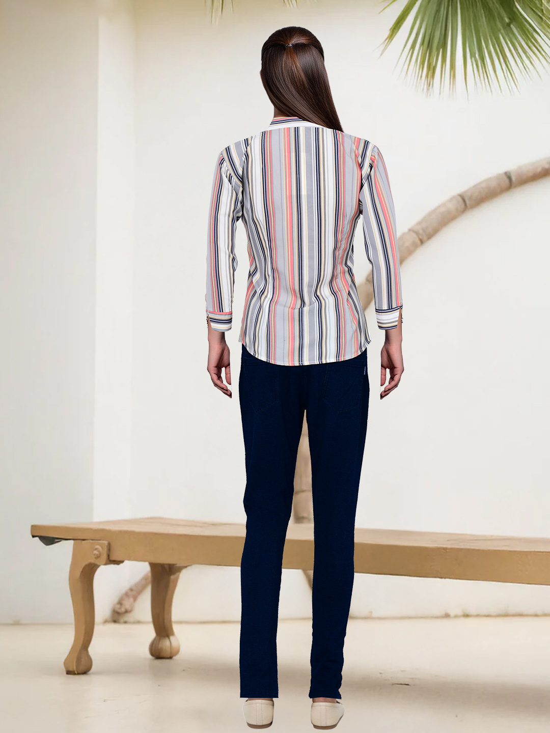 This women’s striped print shirt features a classic fit with a smart front button-down closure. Designed with vertical stripes for a flattering silhouette, it’s perfect for effortless smart-casual and everyday wear.