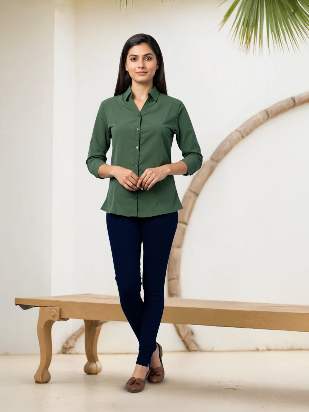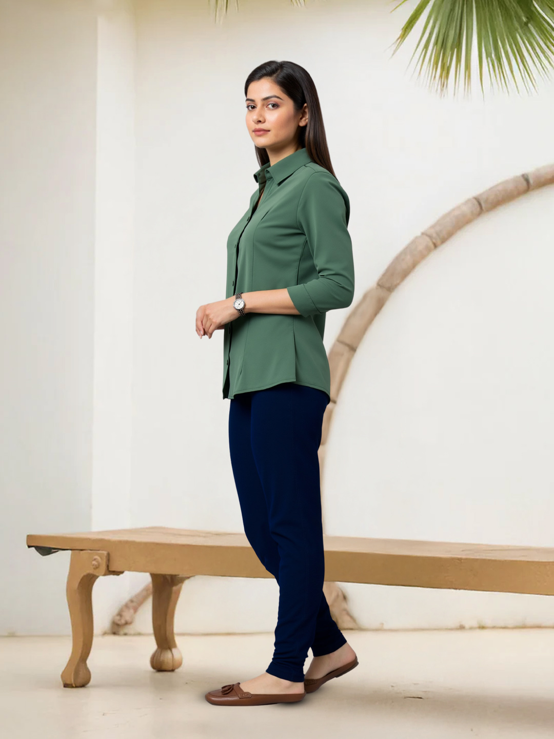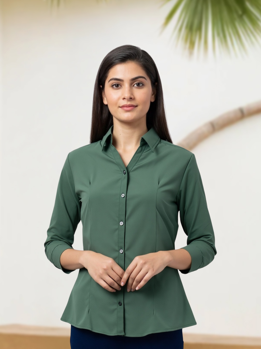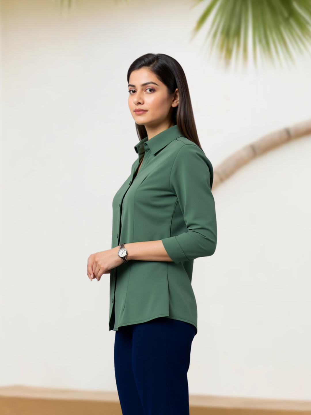 This women’s formal shirt is tailored for a smart and confident appearance. Featuring comfortable three-quarter sleeves and a sleek plain finish, it pairs effortlessly with trousers, skirts, or formal pants.