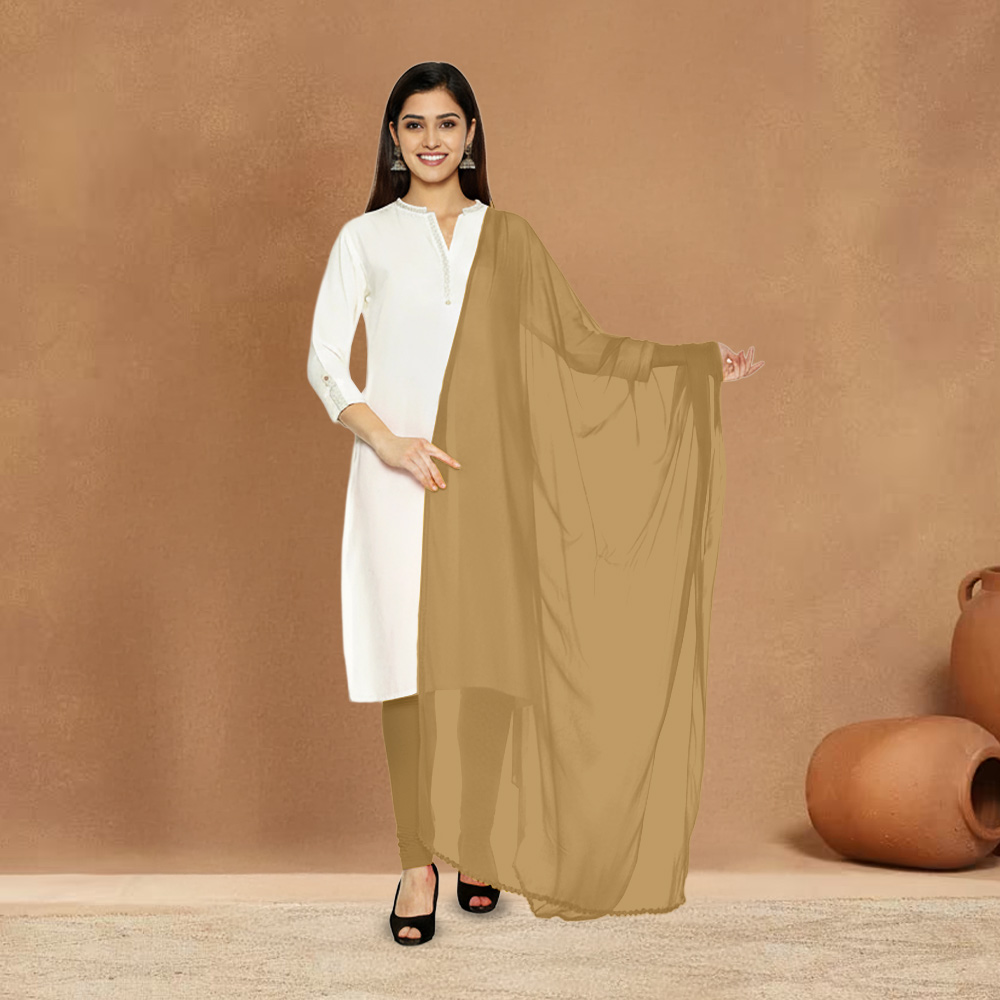 Elevate your daily style with this Sandal Chiffon Solid Dupatta. The soft, earthy sandal hue exudes understated charm and blends effortlessly with a wide range of outfits. Crafted from lightweight chiffon, it drapes beautifully and adds a graceful flair to your everyday ethnic or Indo-western looks. Ideal for work, college, or casual outings.