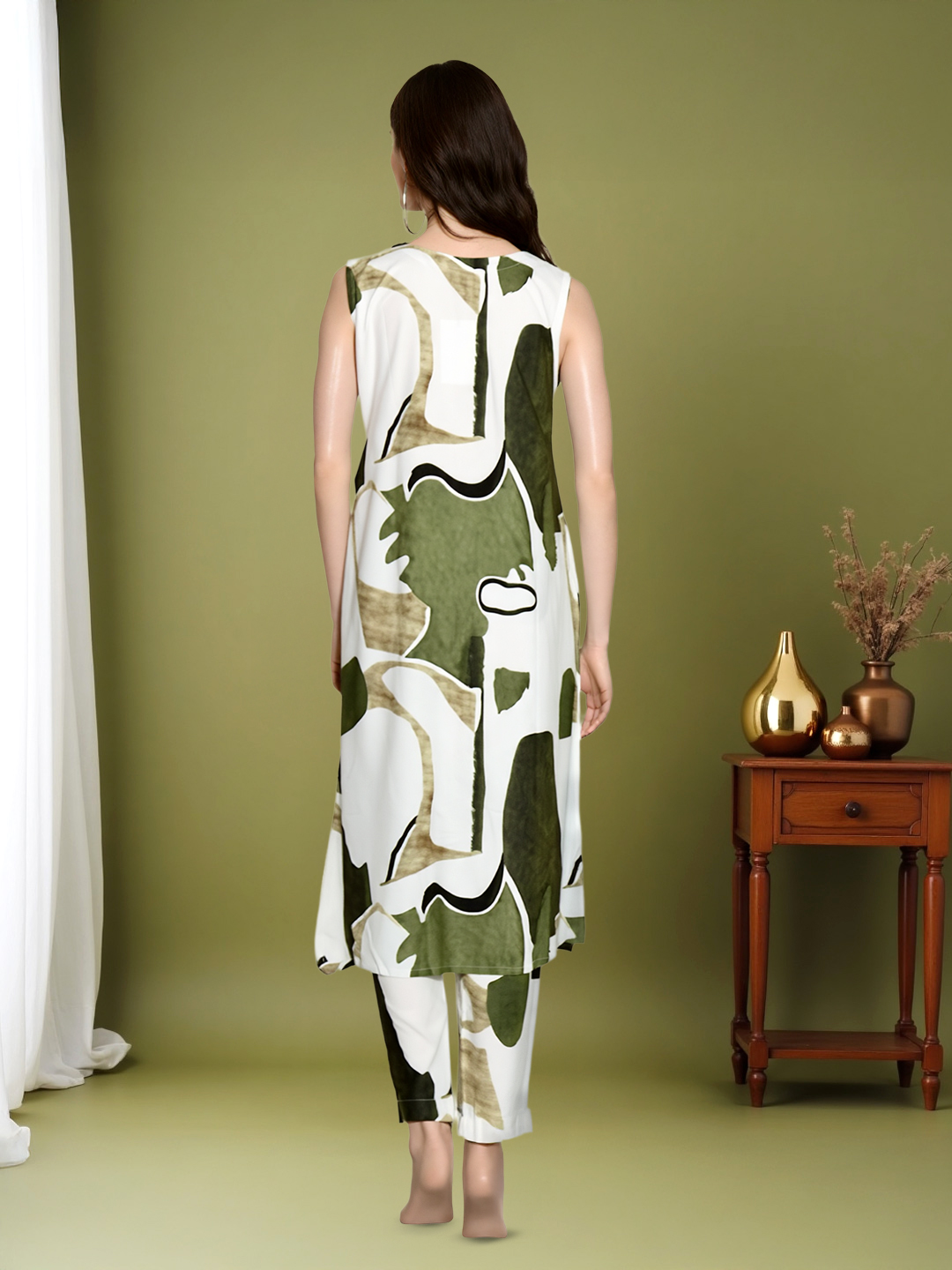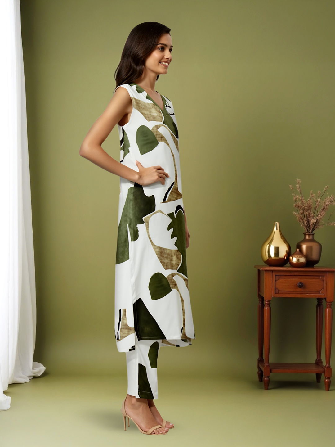 When less is more, this kurta-pant set delivers. The clean V-neckline, sleeveless design, and streamlined fit come together with striking abstract prints for a look that's effortlessly chic — day to night.