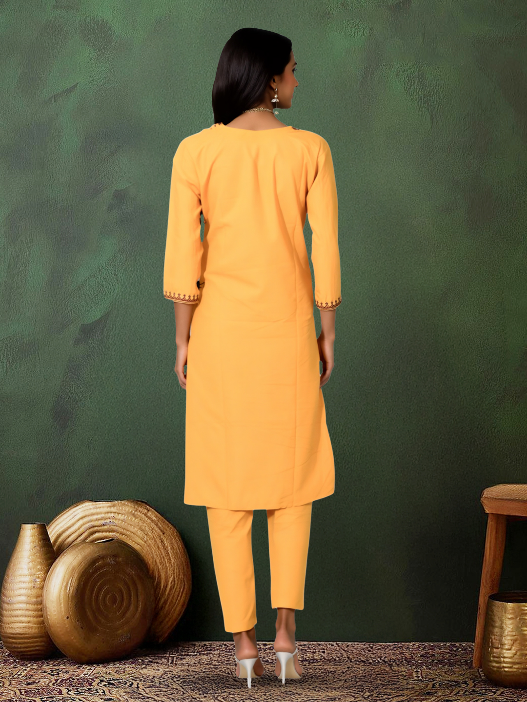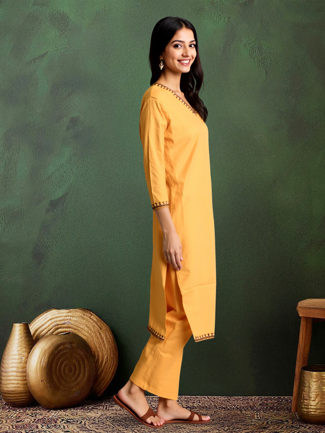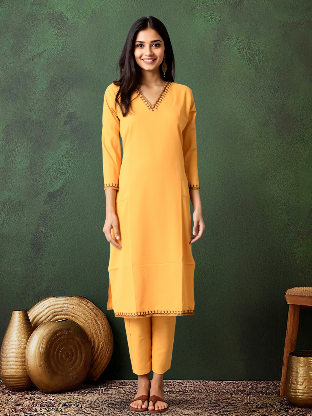 This elegant ensemble is designed for those who appreciate clean lines, delicate detailing, and effortless beauty. The intricate neckline work and sleek silhouette offer a perfect balance of class and comfort, making this set your new favorite for festive days, casual outings, or cultural celebrations.
