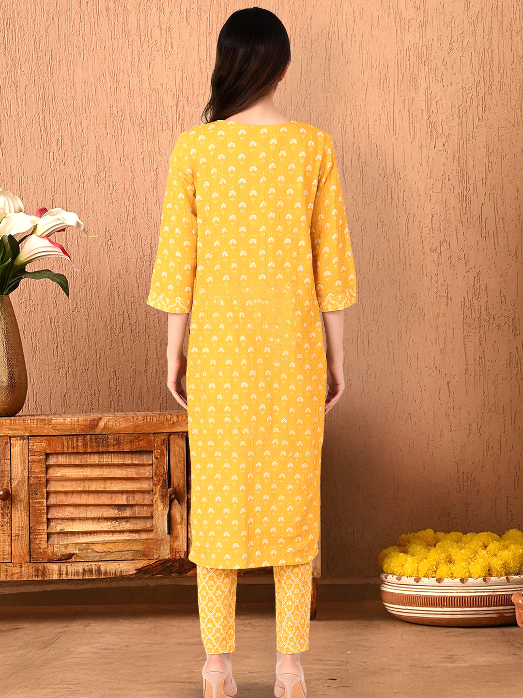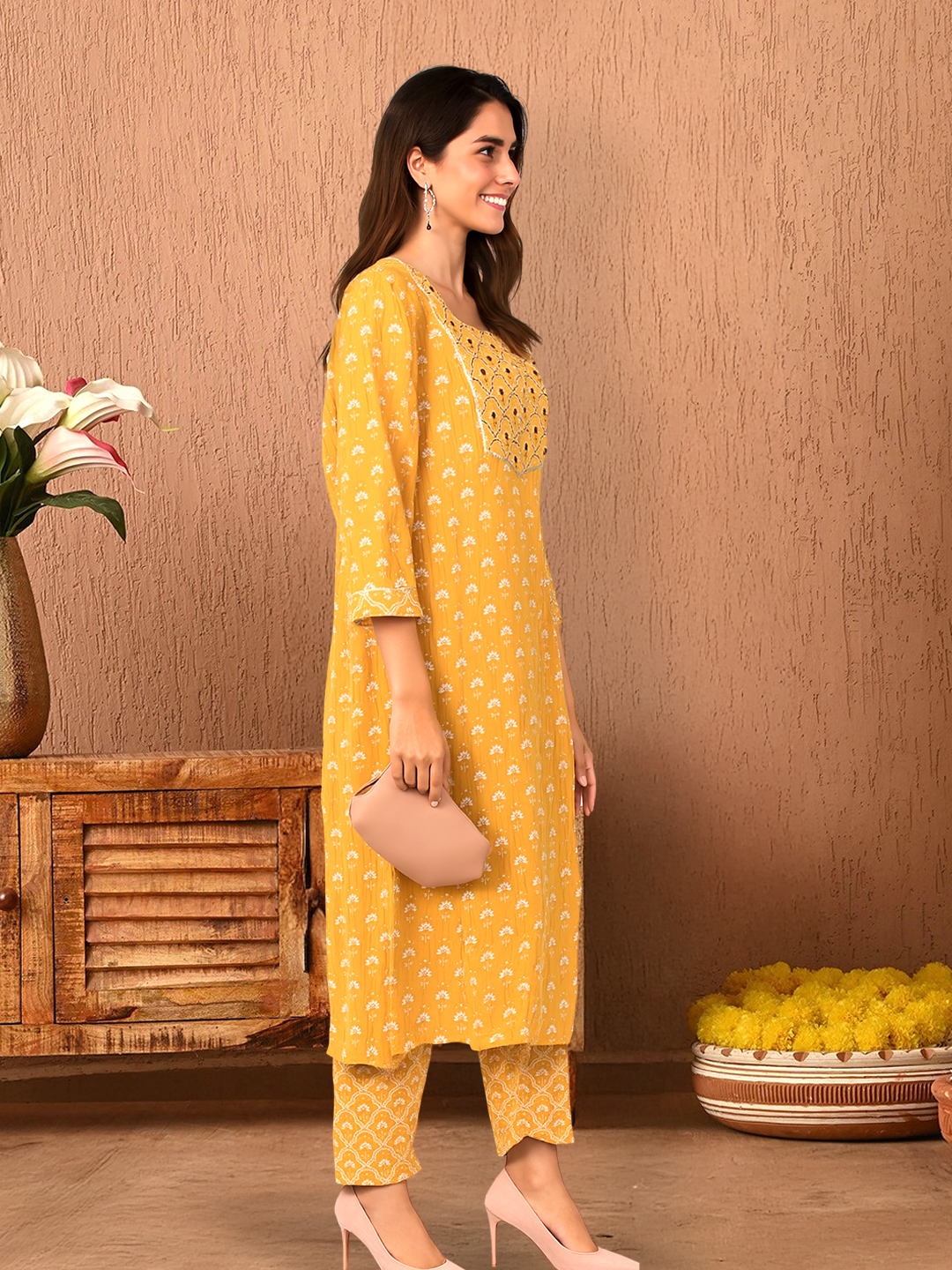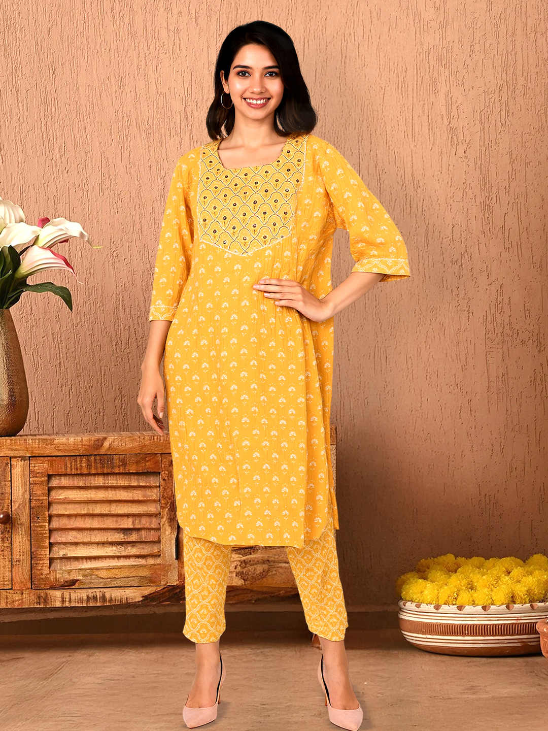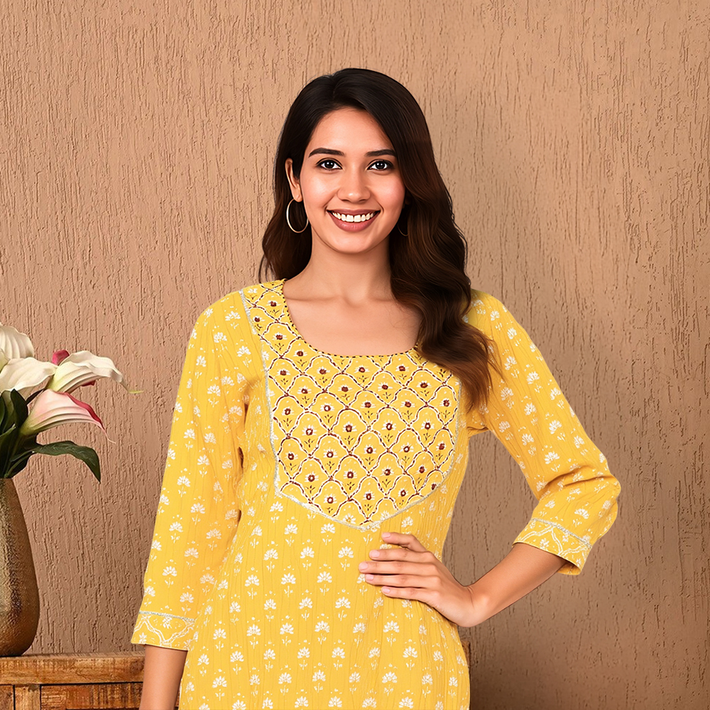 Step into sunshine with this floral printed kurta set that radiates charm and joy. The all-over floral print gives it a lively, classic feel, while the embroidered yoke adds a touch of elegance with its intricate geometric floral detailing. Paired with matching printed pants and a dual-tone dupatta, this ensemble is perfect for everything from brunches to festive afternoons.