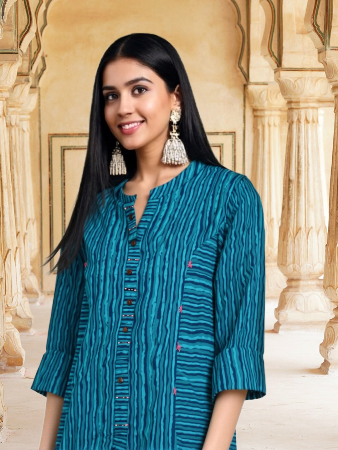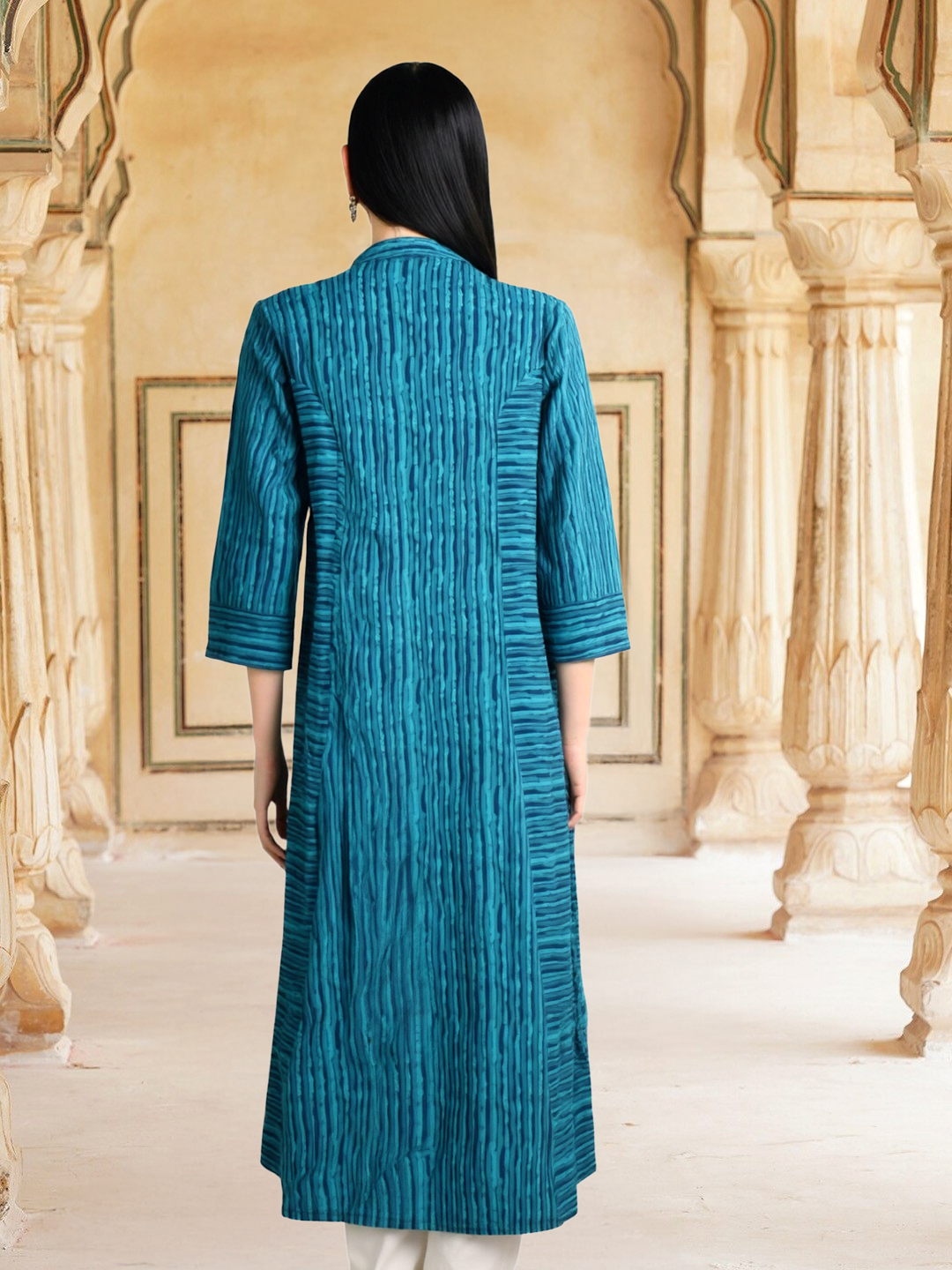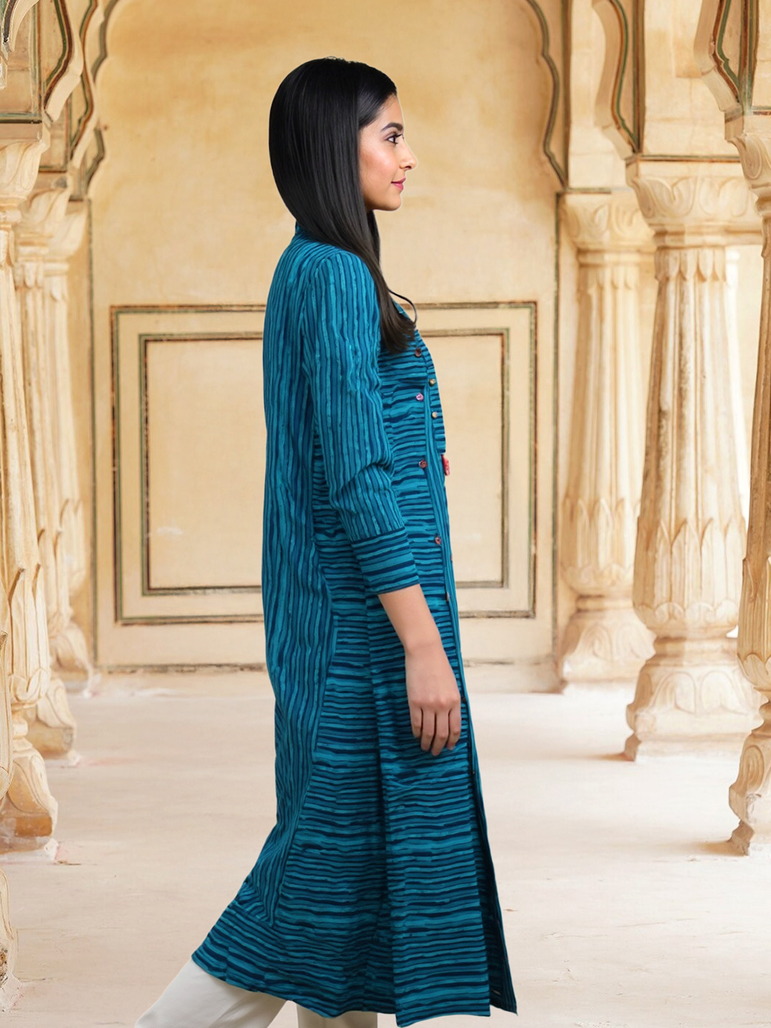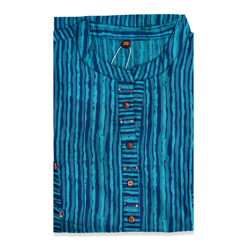 Featuring wooden buttons, turn-up cuffs, and a handcrafted vertical stripe print, this kurta captures effortless grace and mindful design in one elegant silhouette.