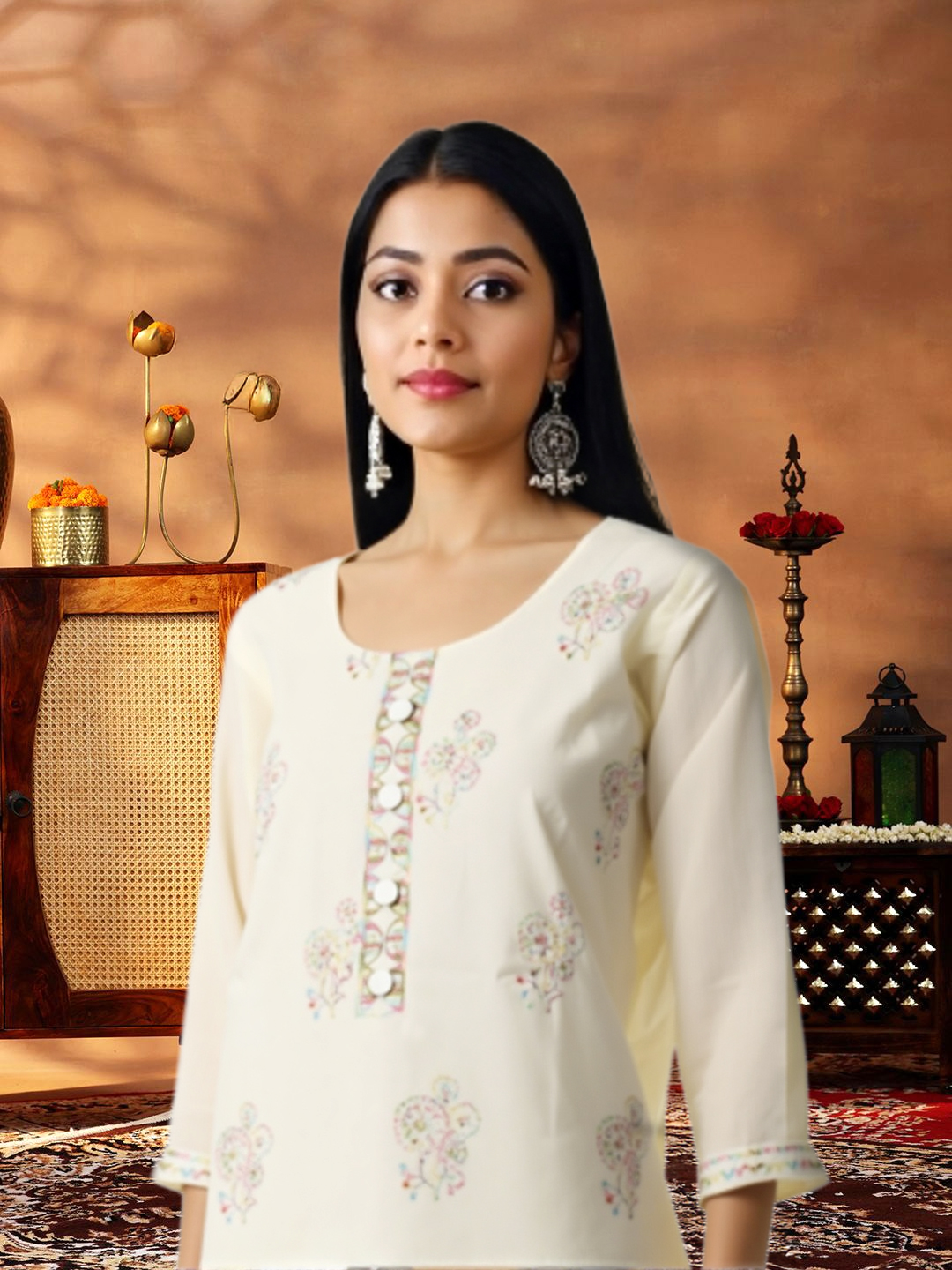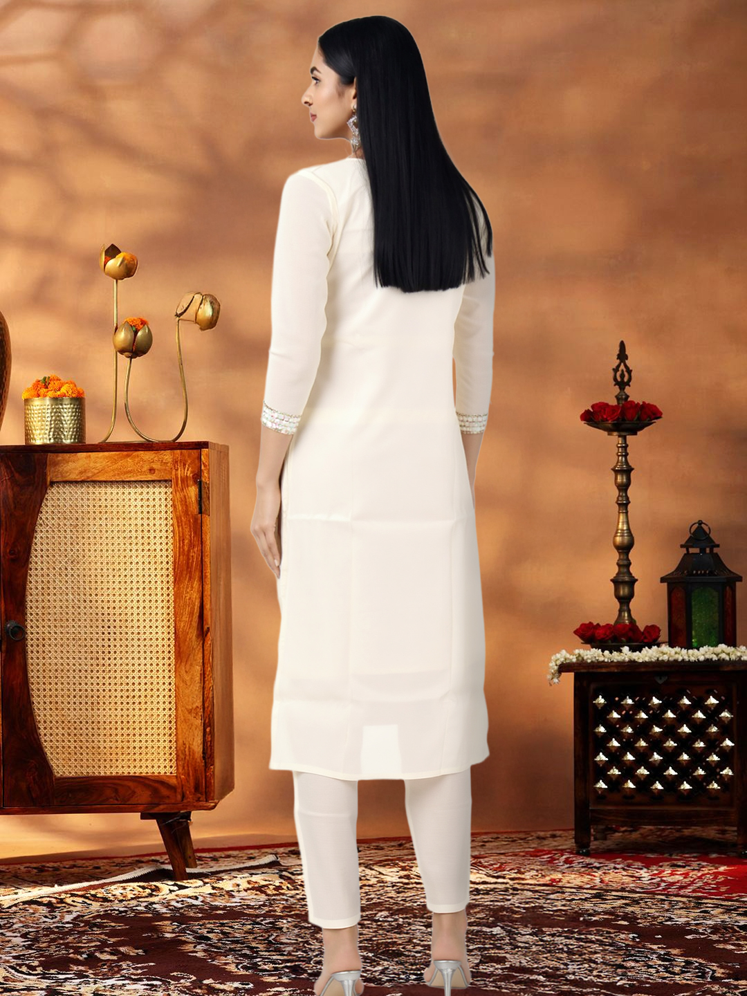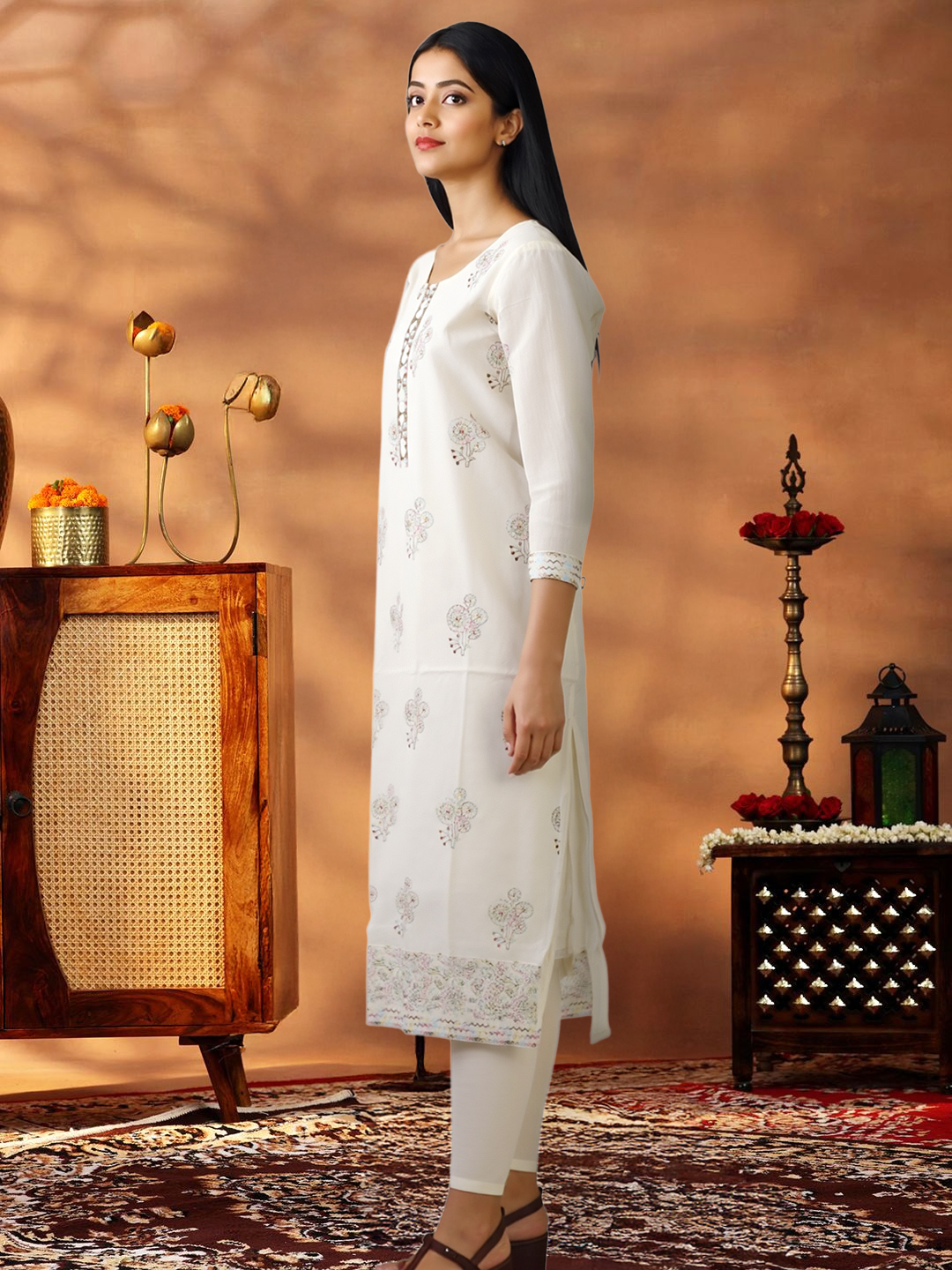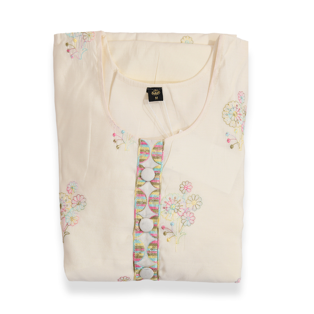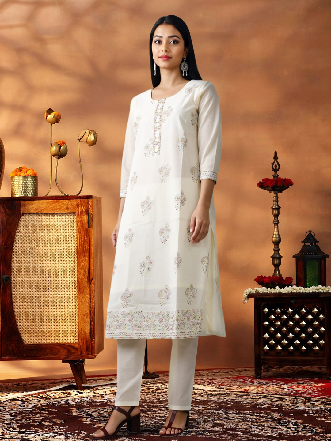 The straight-cut kurta paired with intricate embroidery detailing offers a graceful, understated elegance, perfect for everyday wear or a casual outing.