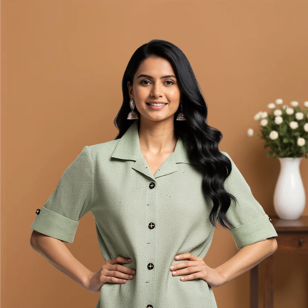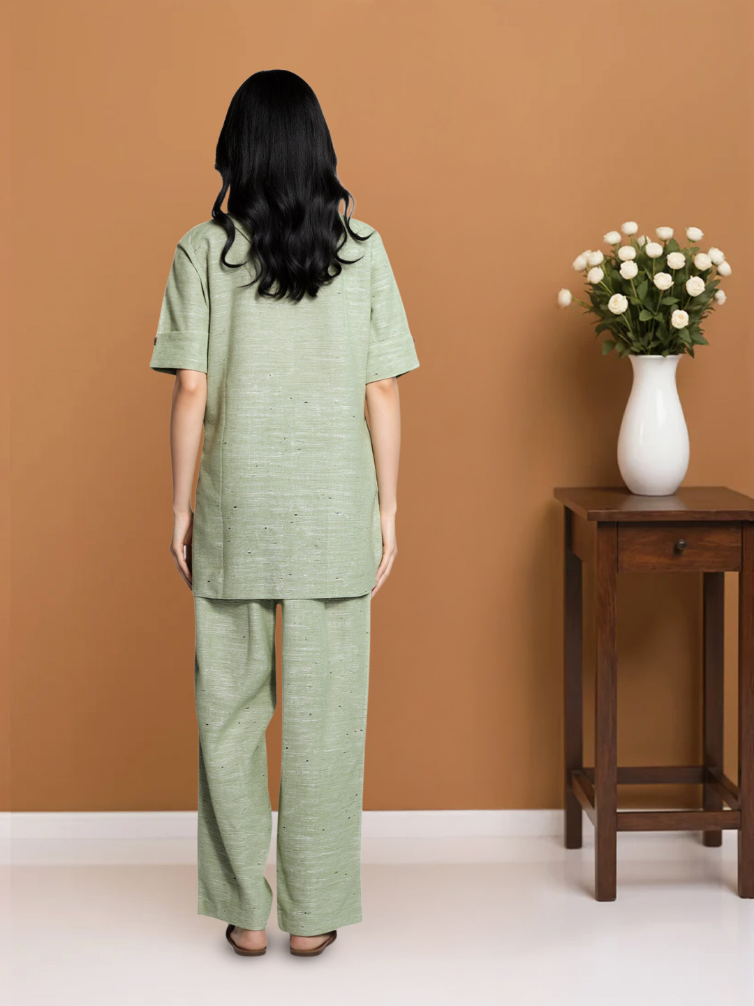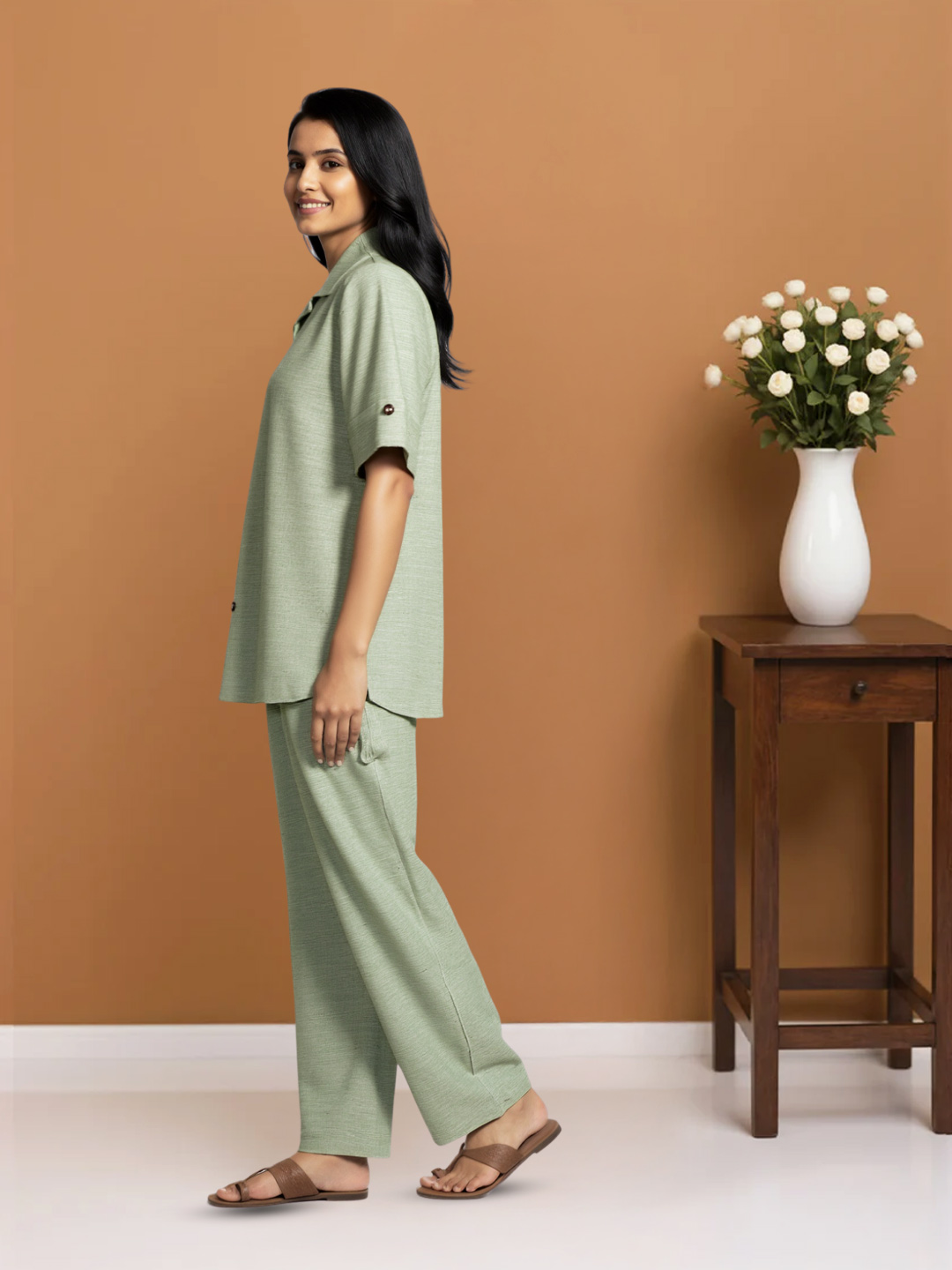 This collared co-ord set offers the perfect blend of tailored charm and all-day comfort. The button-down top lends a formal touch, while the palazzo trousers bring ease and elegance — a wardrobe must-have for the modern woman.