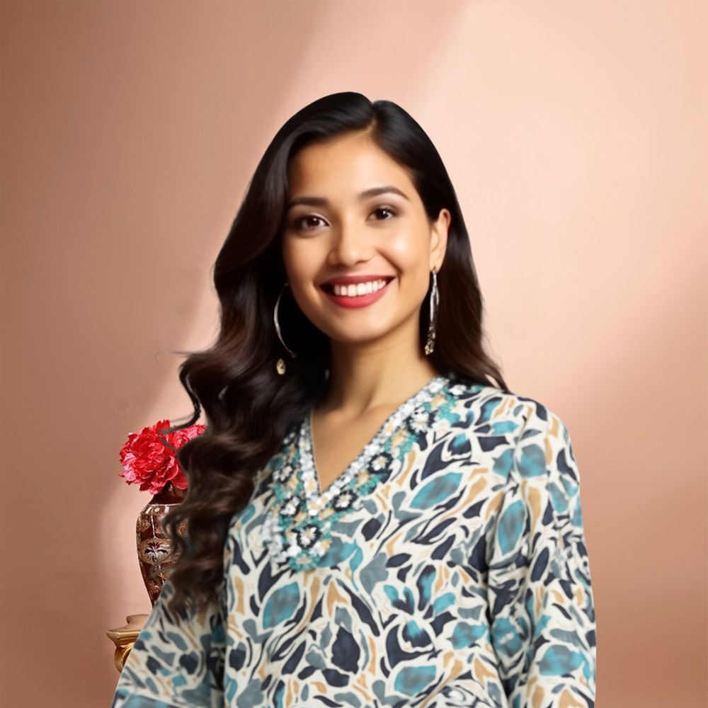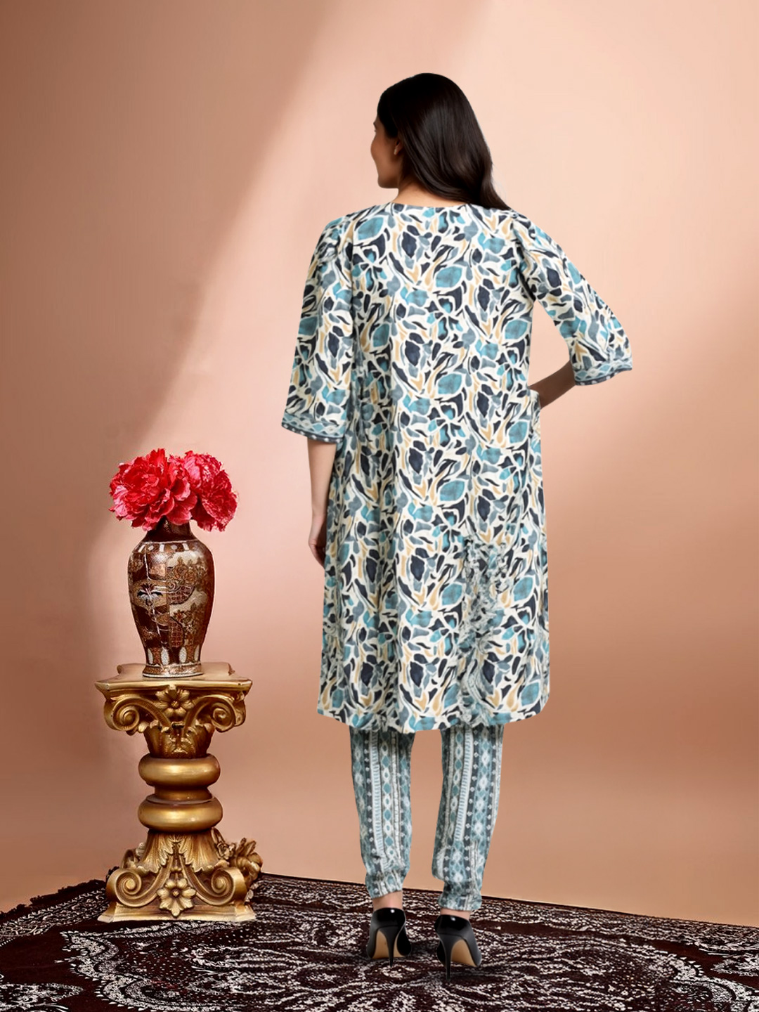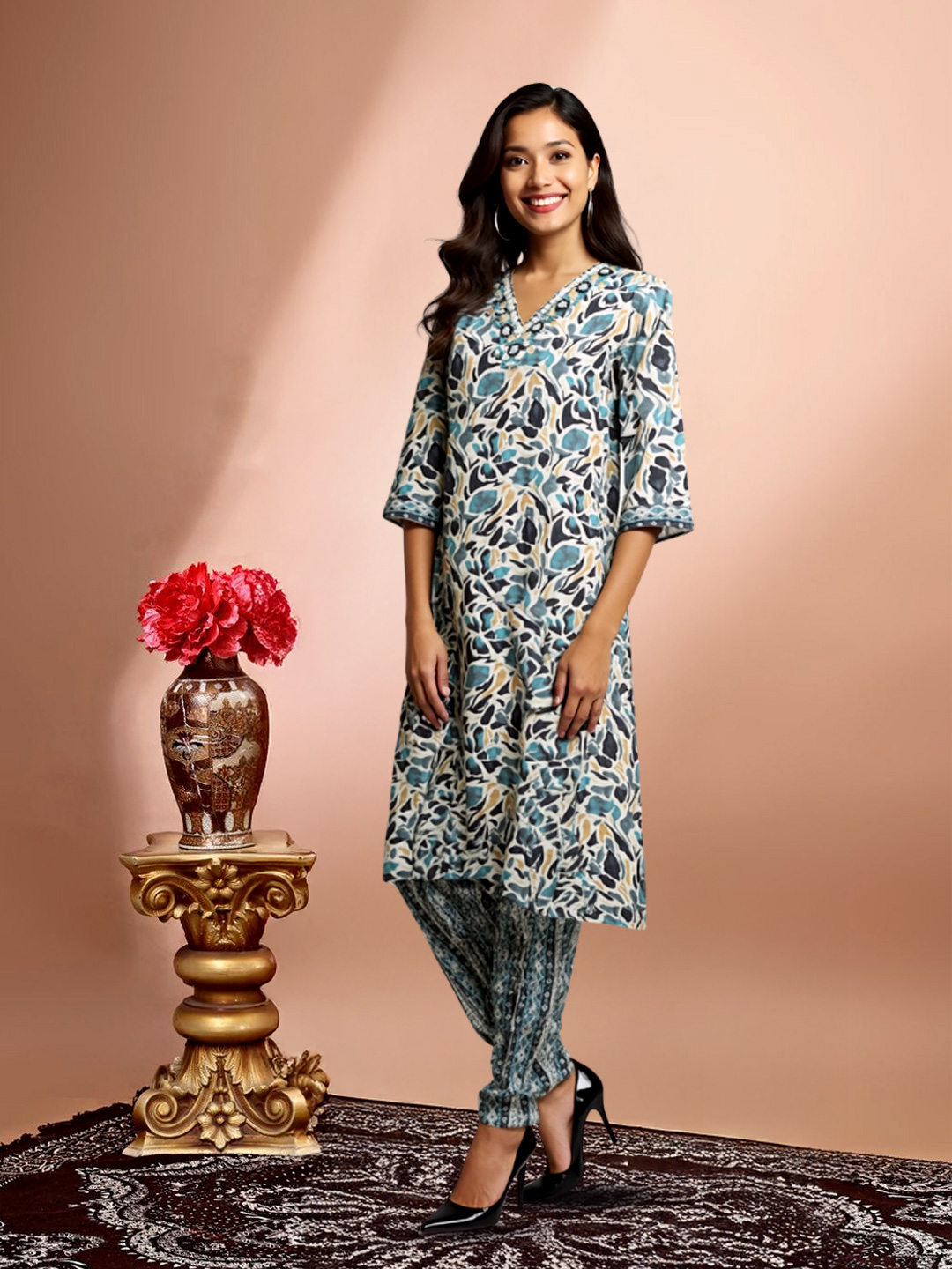 Showcasing an all-over abstract leaf print, this kurta set captures nature’s grace with a modern, artistic twist — fresh, feminine, and effortlessly chic.