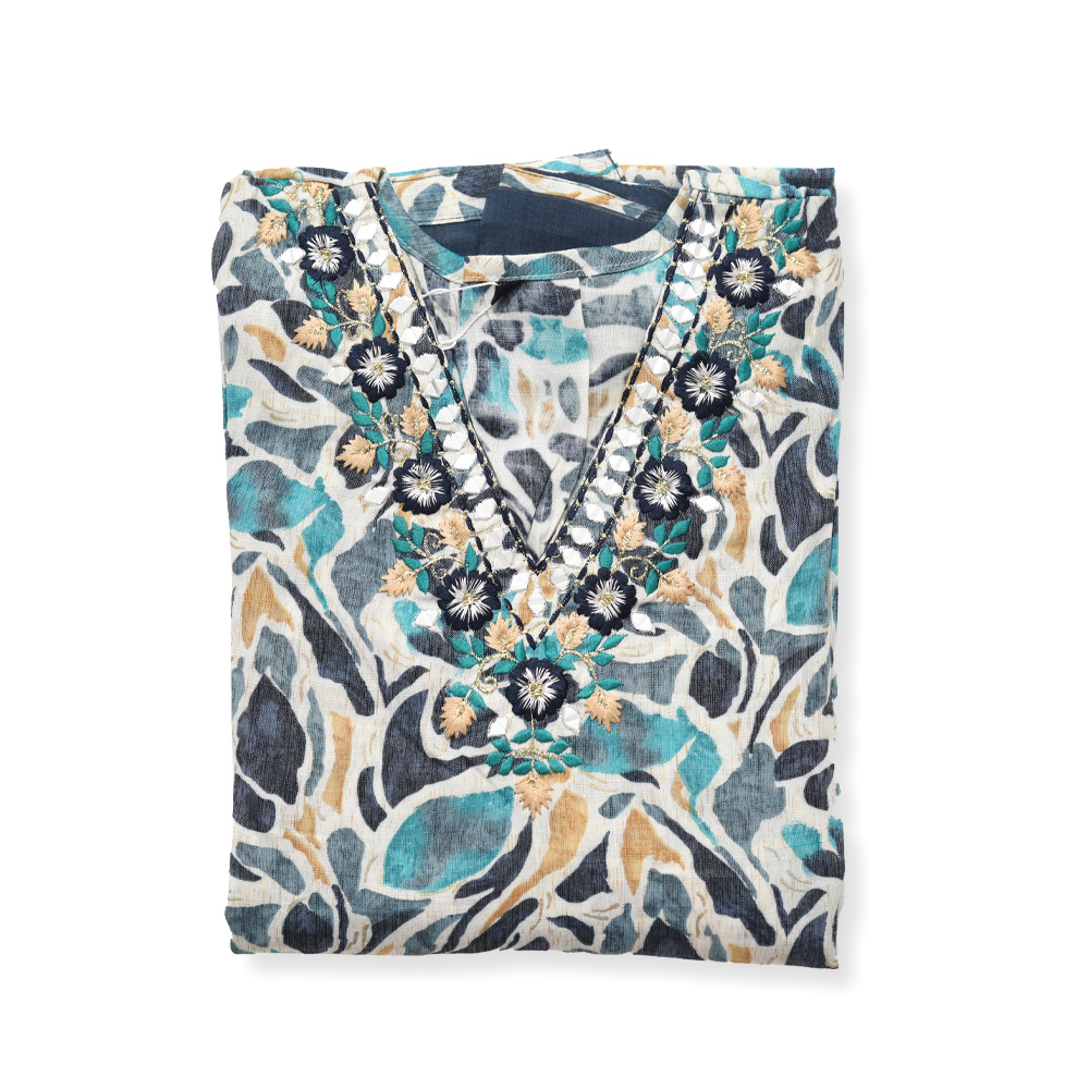 3/4th sleeves finished with printed hem detailing offer the perfect balance of structure and softness for a refined ethnic silhouette.