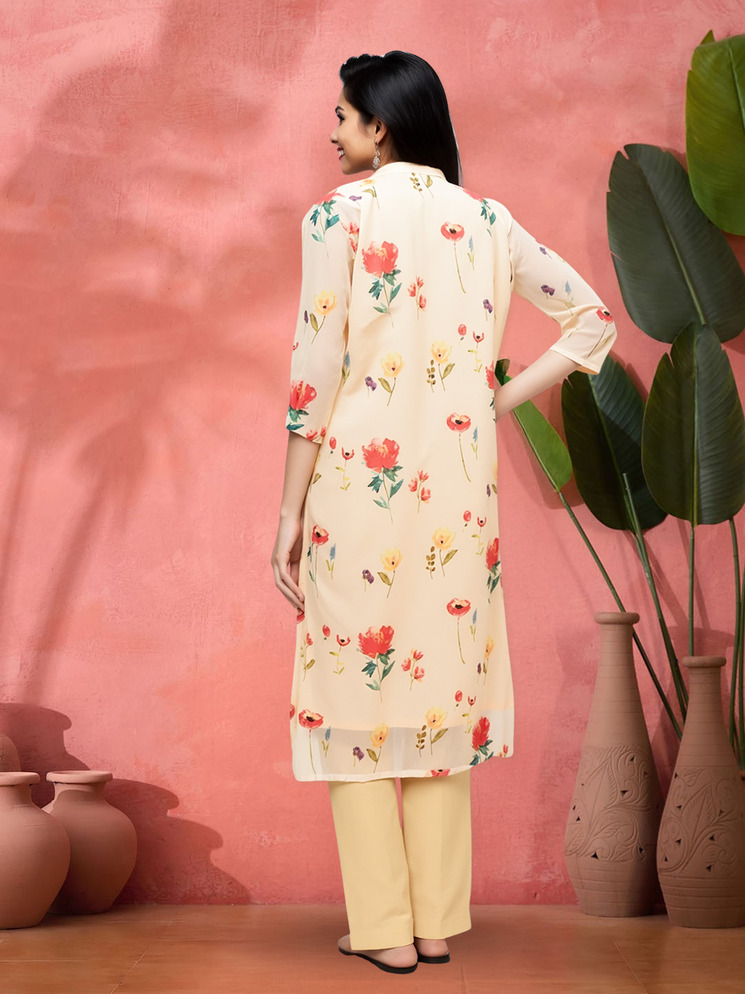 The soft peach color of this set, paired with multi-hued floral prints, flatters every skin tone and brings a gentle vibrance to your wardrobe. It's ideal for transitional weather, summer occasions, or light festive wear.