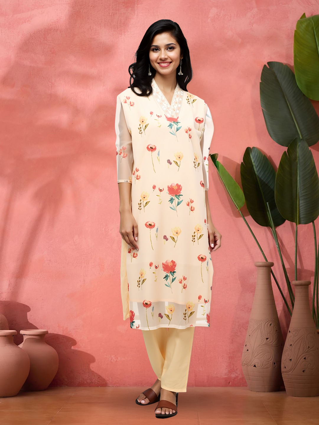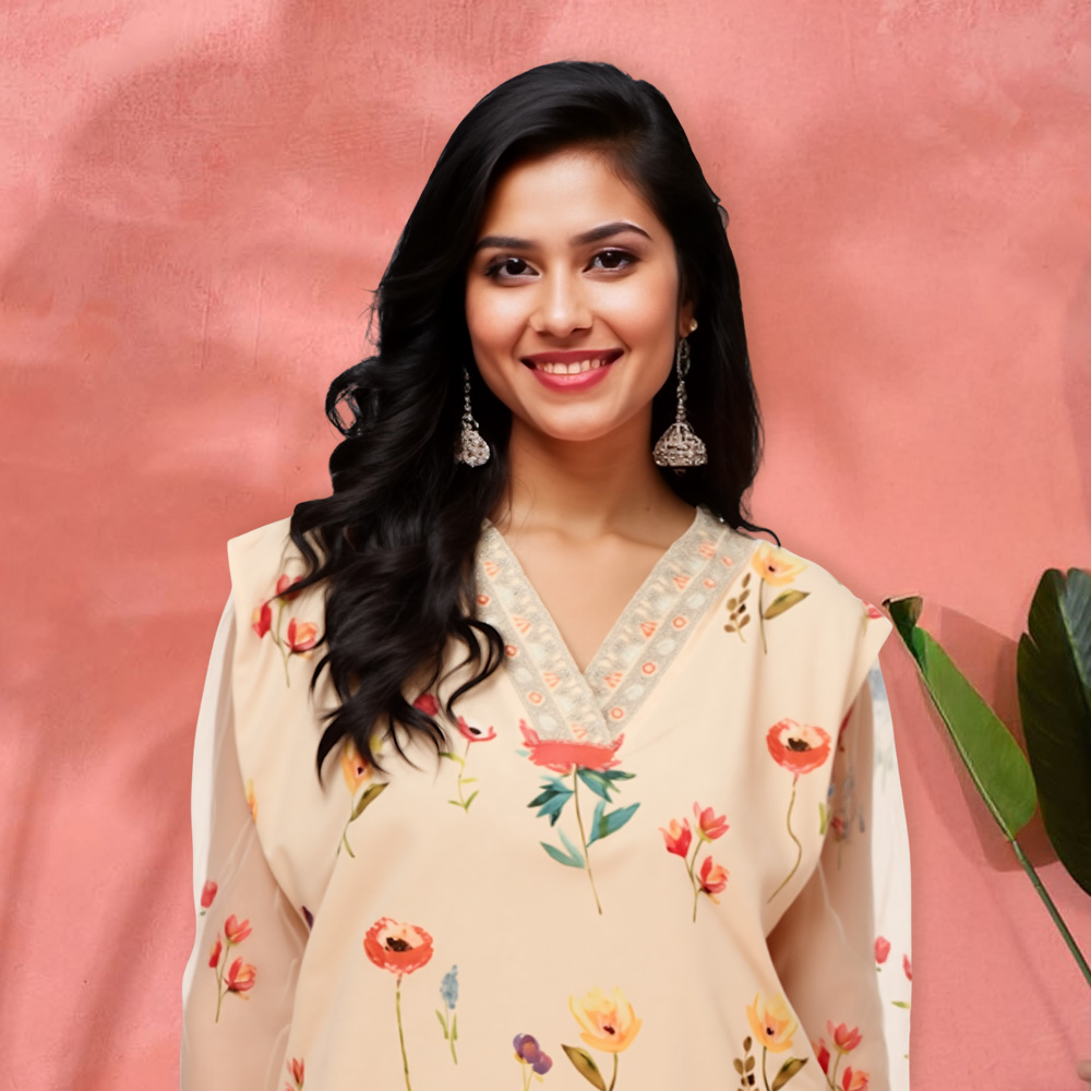 Step into elegance with this beautifully printed kurta set, adorned in delicate floral motifs that celebrate the freshness of nature. The soothing peach tones paired with vibrant blossoms make this ensemble perfect for brunches, daytime festivities, or intimate gatherings.