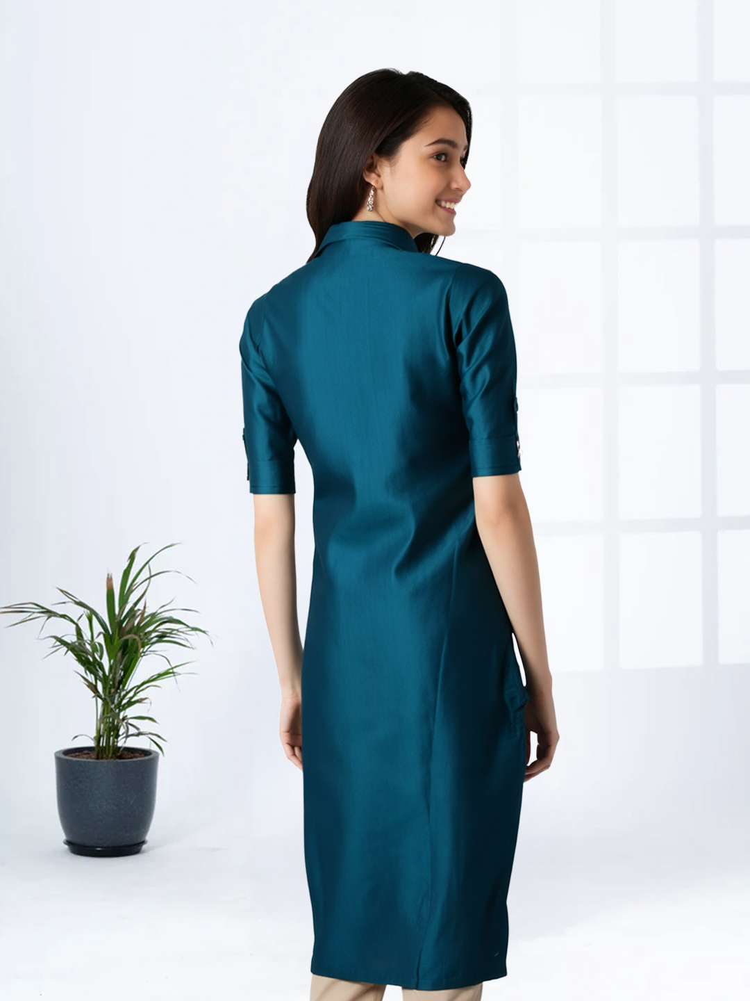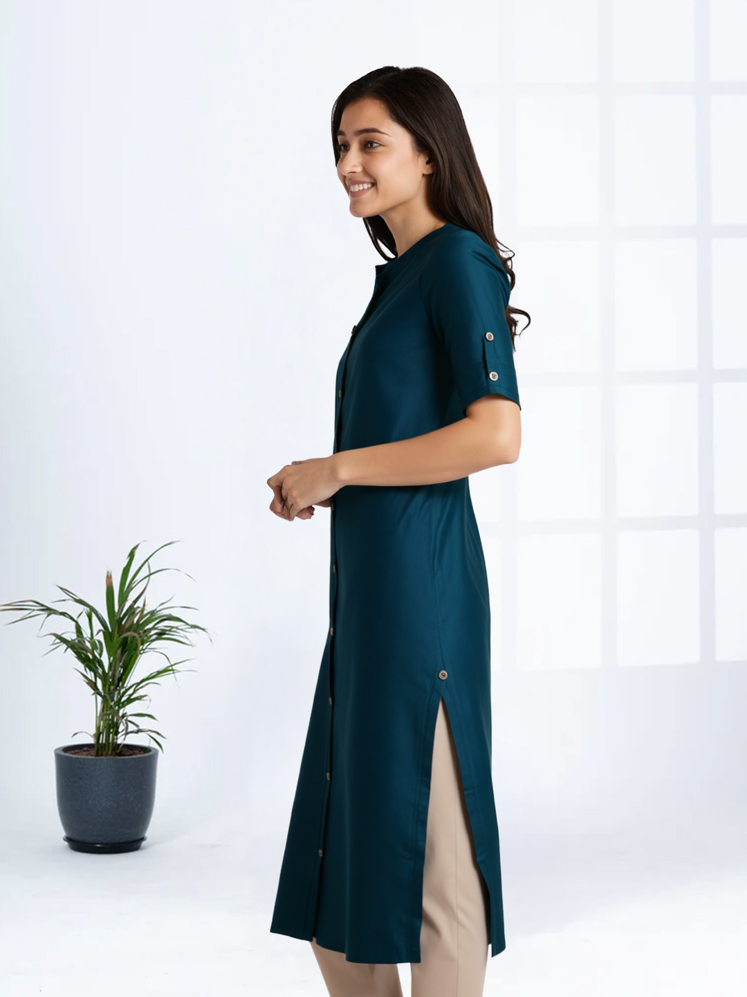Designed with a high round Mandarin Collar neckline and elbow-length sleeves, this kurta strikes the perfect balance between contemporary chic and traditional comfort. The button-down front adds a subtle touch of style, giving you the flexibility to wear it as a relaxed piece or dress it up with accessories. Ideal for daily wear or festive occasions, it promises both comfort and fashion-forward appeal.