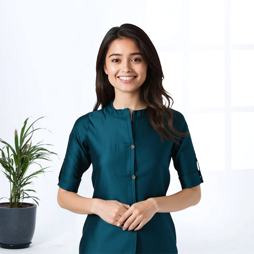 This high round Mandarin Collar neckline kurta is the embodiment of versatility. Whether you're dressing it up with statement jewelry for an evening gathering or wearing it casually for a day out, the button-down front and elbow-length sleeves make it the perfect choice for any occasion. Its timeless design offers endless styling possibilities, ensuring you always look chic and put-together.