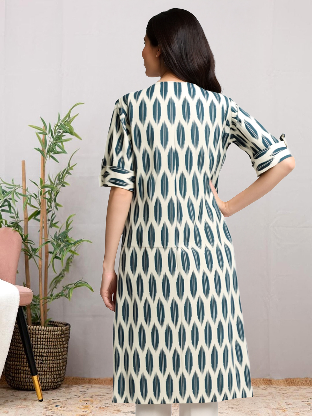The timeless beauty of Ikat meets contemporary tailoring in this elegant straight kurta. A mandarin collar and roll-up sleeves add a crisp, modern finish to your everyday ethnic style.