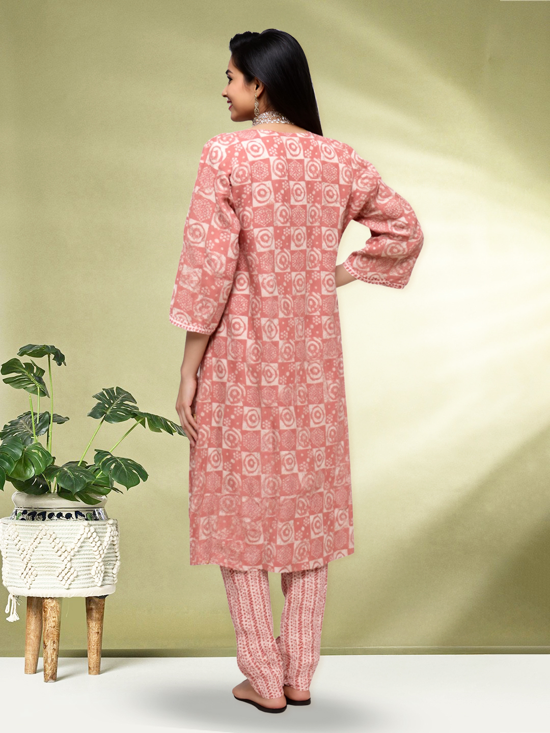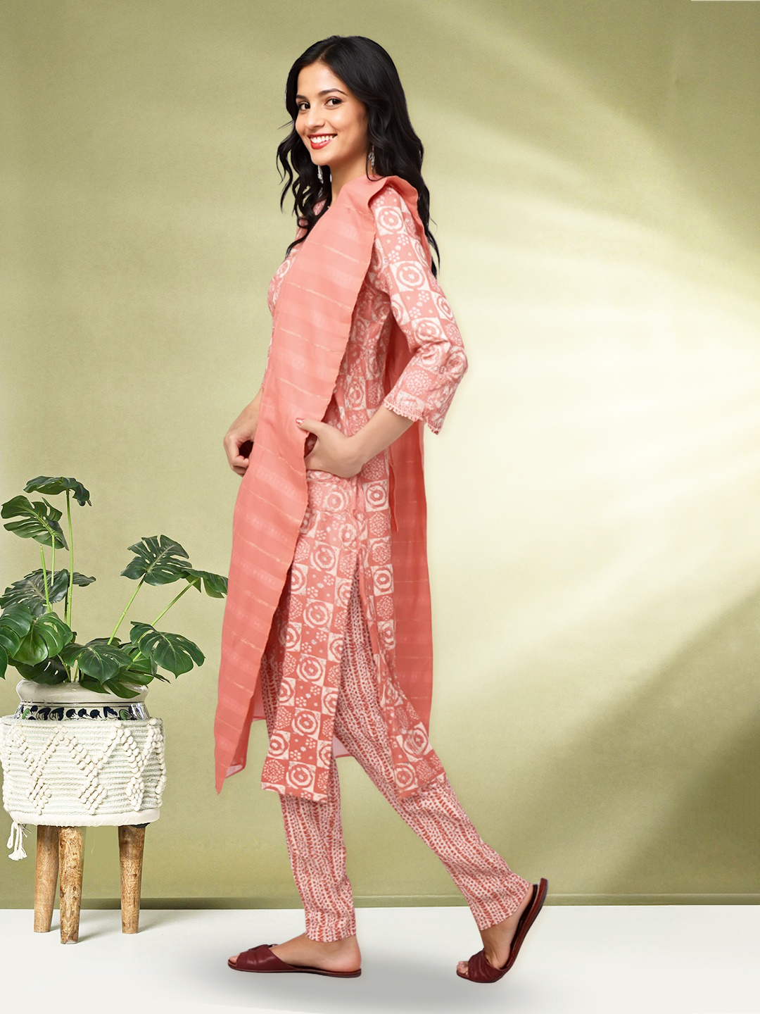 Step into effortless elegance with this straight-cut kurta set, showcasing traditional block prints in a modern silhouette. The round neckline and 3/4th sleeves add a subtle charm, while the printed tapered pants ensure comfort with style. The light dupatta with horizontal stripe accents brings a graceful flow to your look—ideal for festive mornings or family evenings.