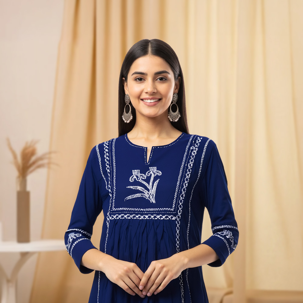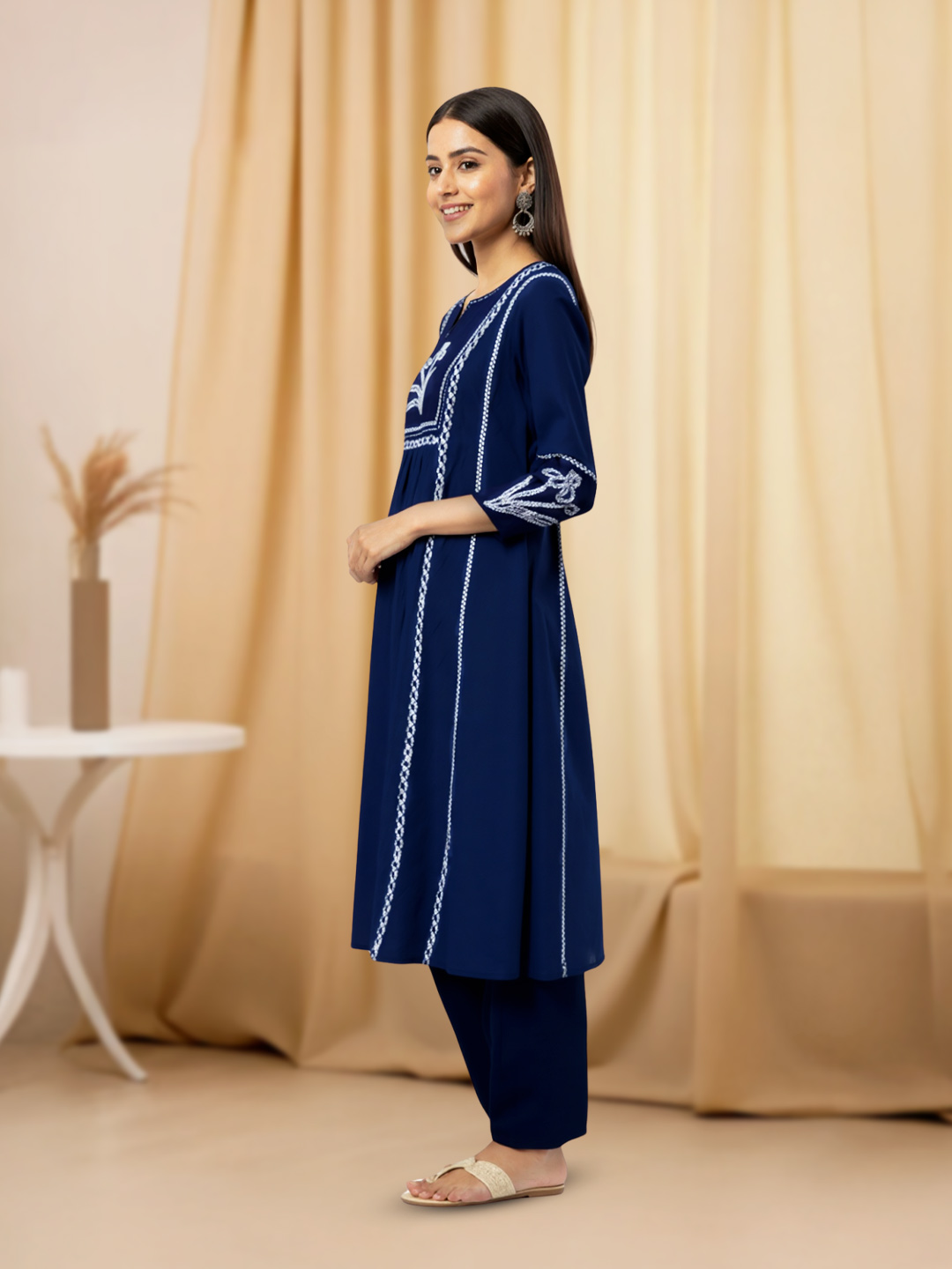 With a notched round neck and classic embroidery, this suit set effortlessly merges modern cuts with ethnic richness—perfect for the modern woman who cherishes her roots.