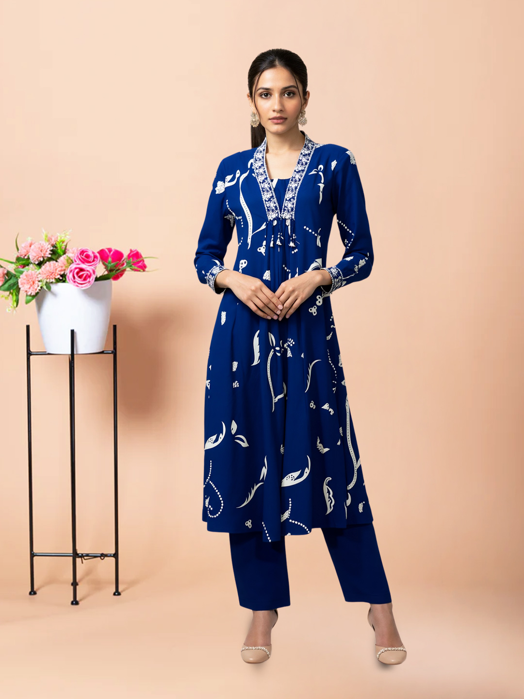 Step into timeless sophistication with this salwar suit set that perfectly balances print, embroidery, and structure. The kurta is adorned with delicate white floral and abstract prints, finished with a sequin-embellished neckline and printed cuffs. Strategic pleating under the yoke offers movement and shape, while the solid straight-fit trousers and contrasting floral dupatta make this outfit effortlessly eye-catching and event-ready.