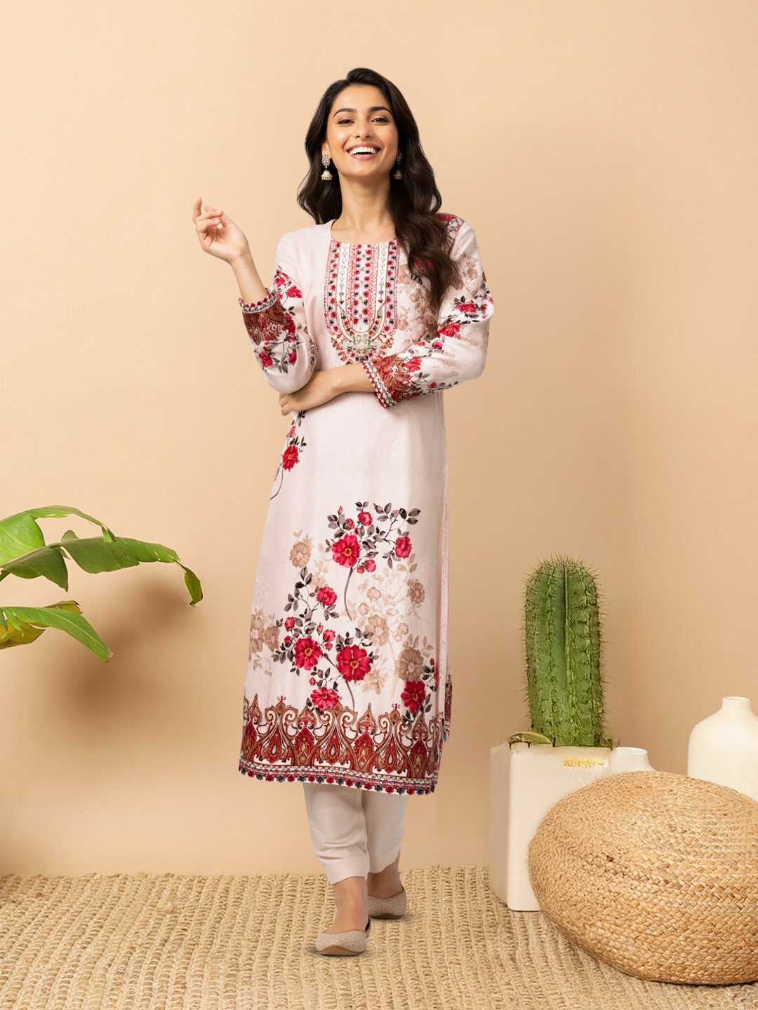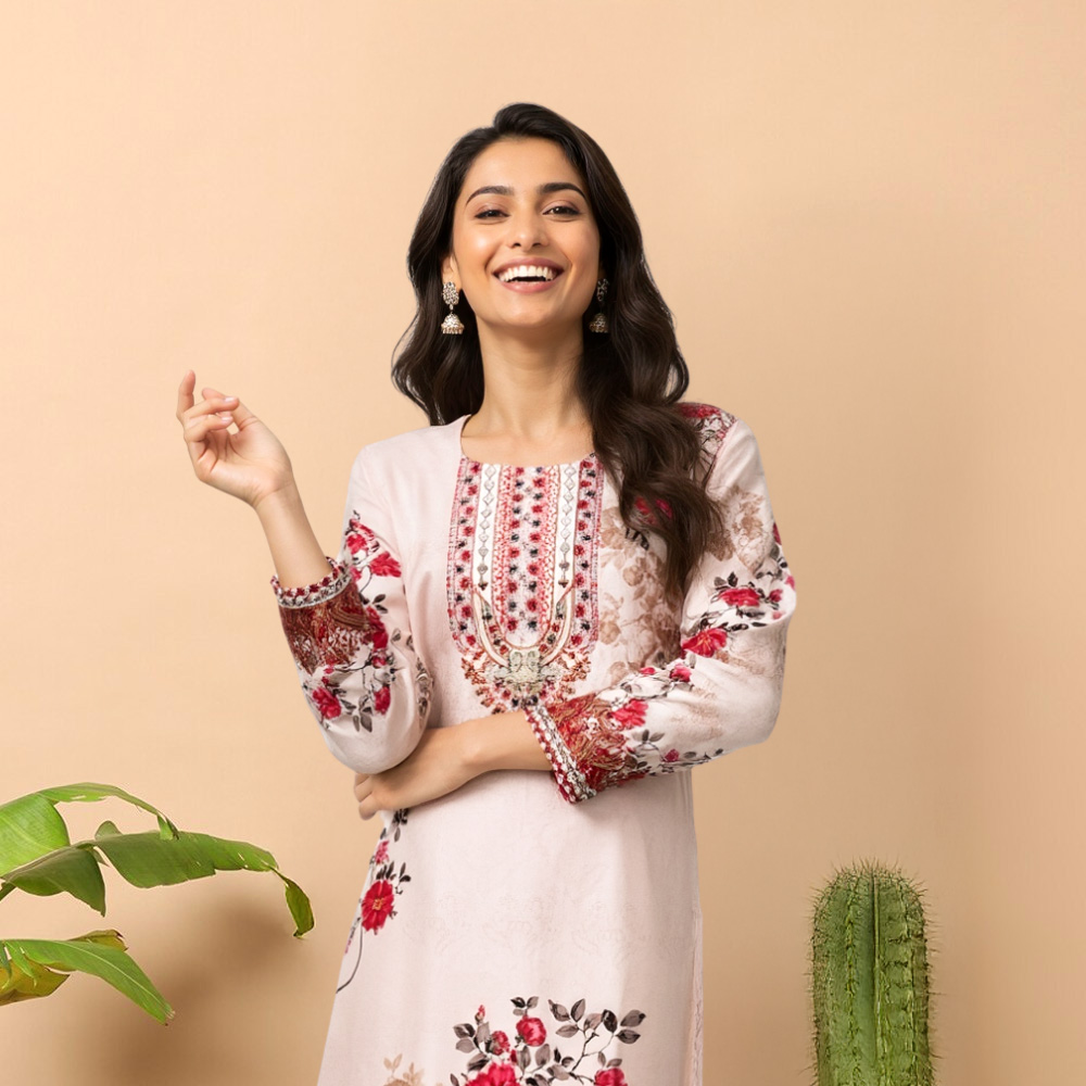 A modern take on a traditional favorite. Featuring a slim-fit kurta with intricate floral embroidery, this set includes a straight-cut pant and a beautifully embroidered dupatta. Perfect for women who love classic Indian wear with a touch of minimal sophistication.