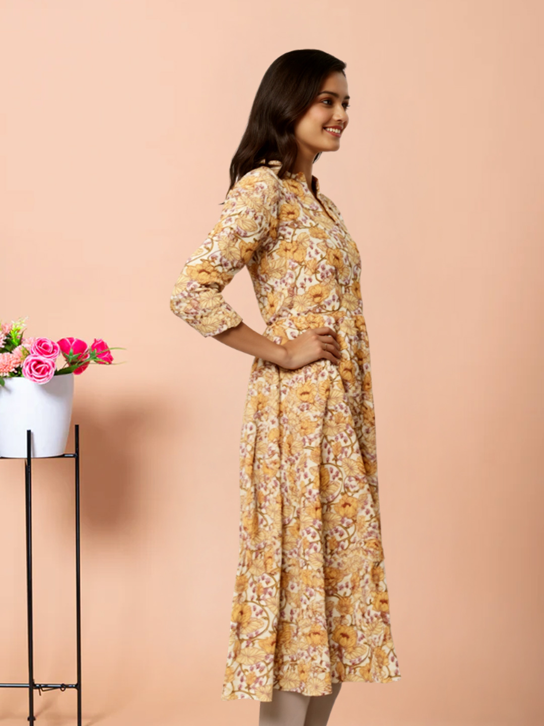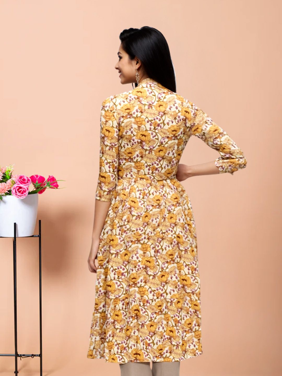 Step out in style with this stunning floral printed Anarkali kurta that combines timeless grace with everyday comfort. The flared silhouette flatters all body types, while the charming floral print brings a refreshing touch to your wardrobe.
