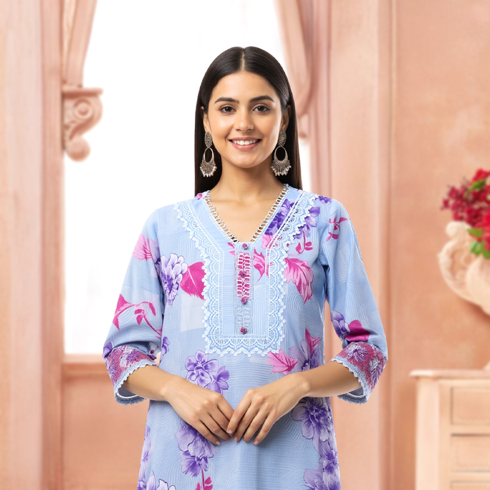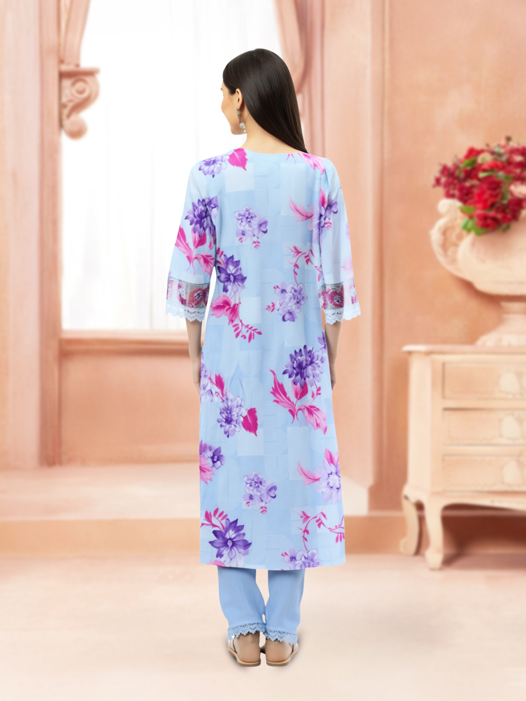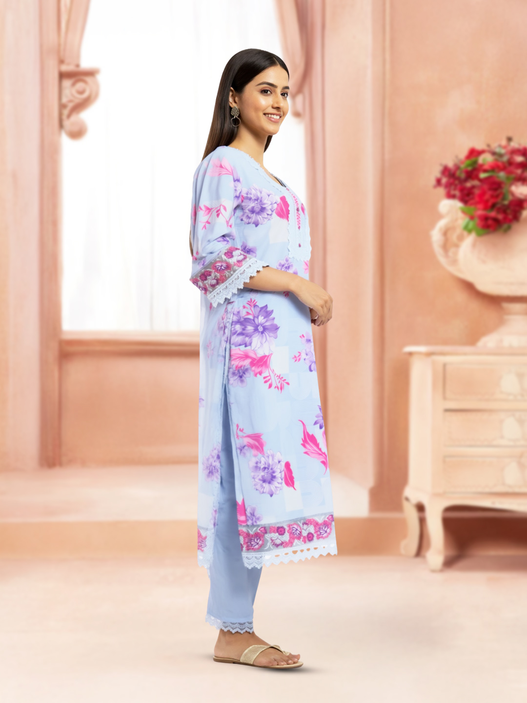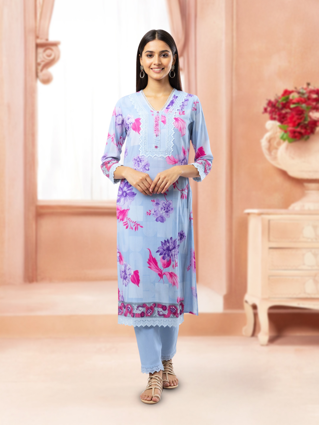 Step out in style with this beautifully floral-printed salwar suit designed to flatter. The scalloped V-neck and lace accents lend a delicate, feminine touch. Perfectly paired with stylish tapered pants and a flowy dupatta, this set is ideal for lunches, brunches, and everything in between.