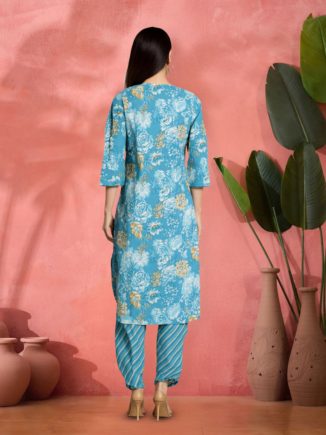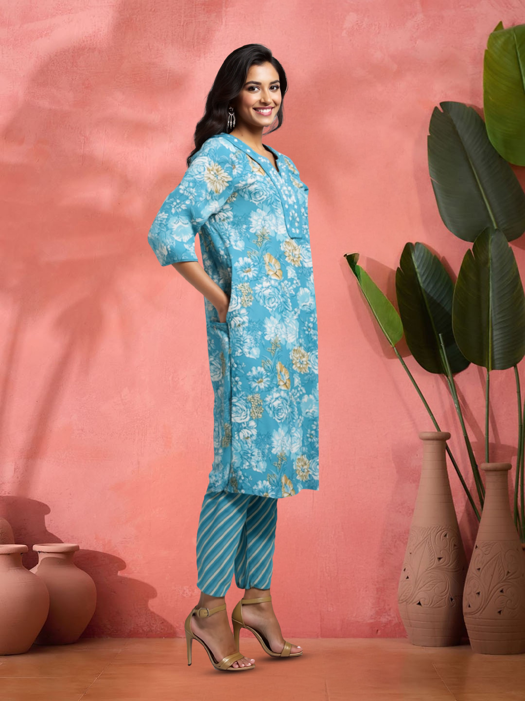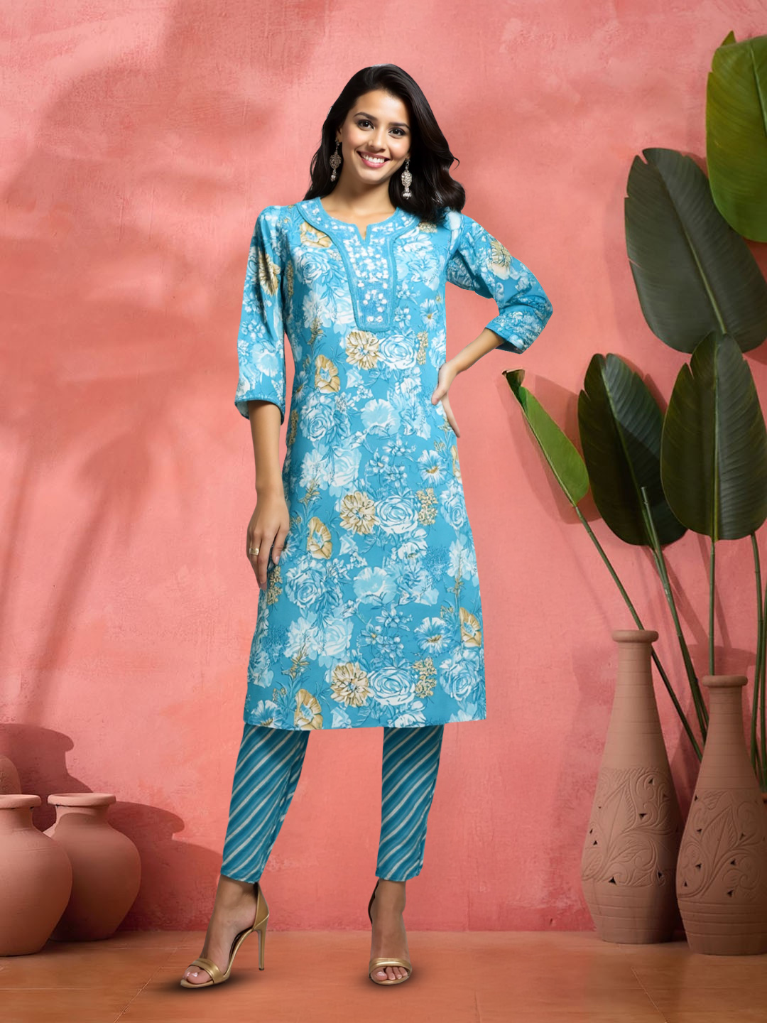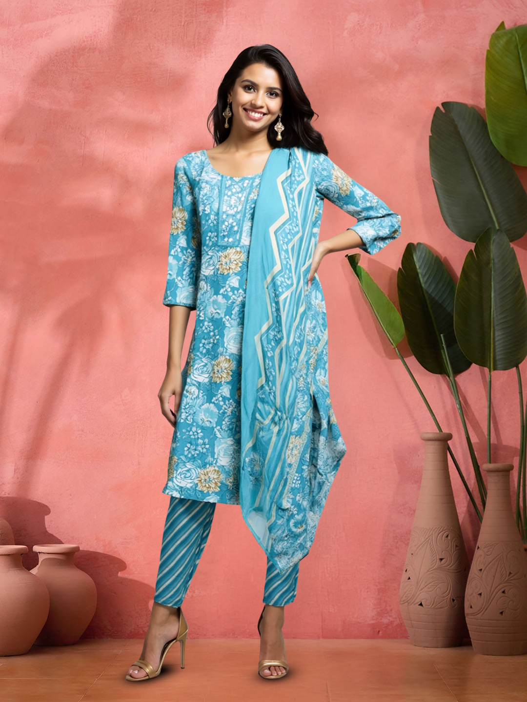 Crafted for the woman who loves detail, this straight-fit kurta with printed bottoms and an eye-catching dupatta creates a stylish yet comfortable silhouette for any occasion.