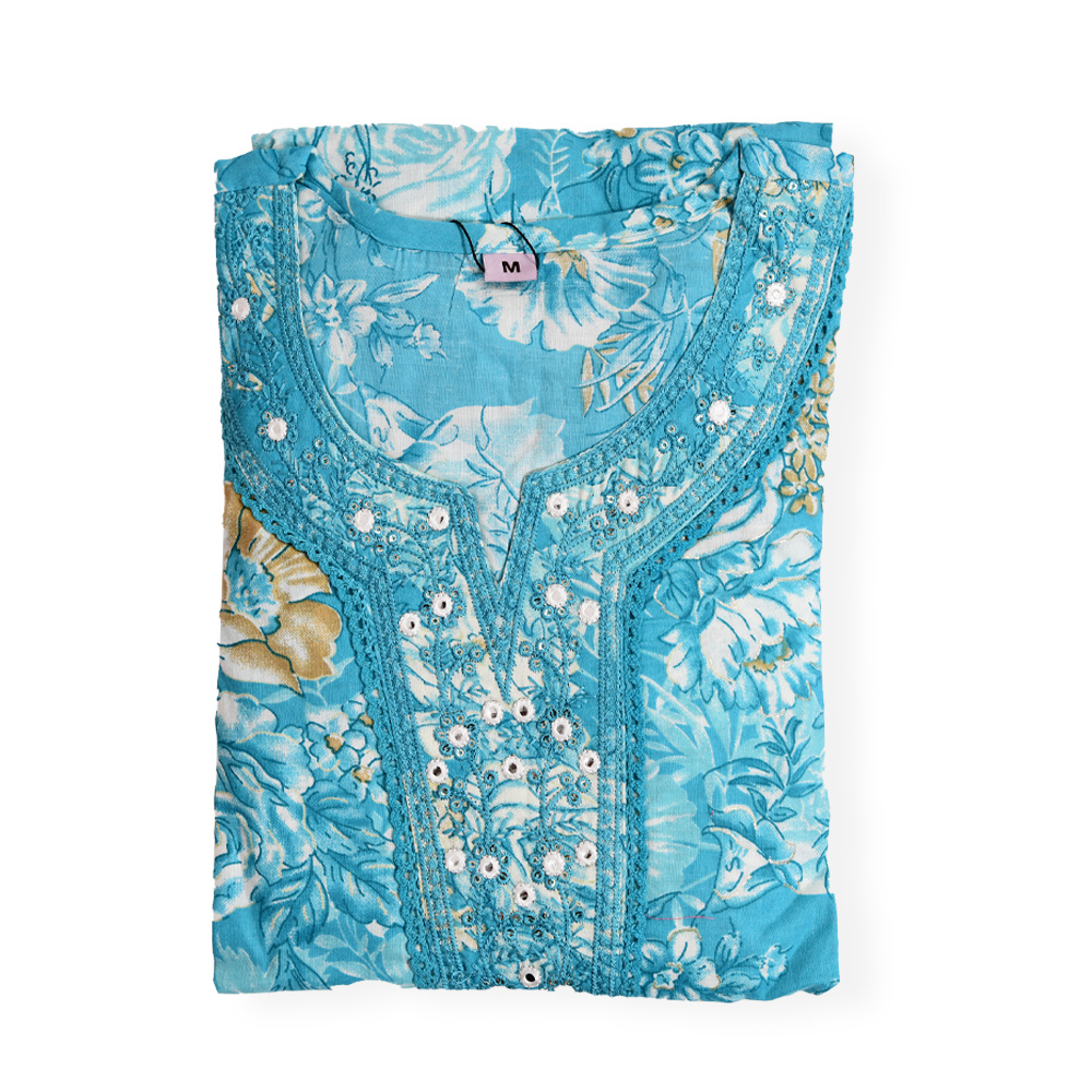 Step into timeless elegance with the Grace in Bloom Kurta Set. With its floral embroidered neckline and mirror detailing, this outfit captures the essence of ethnic sophistication. Pair it with jhumkas for a graceful daytime look.