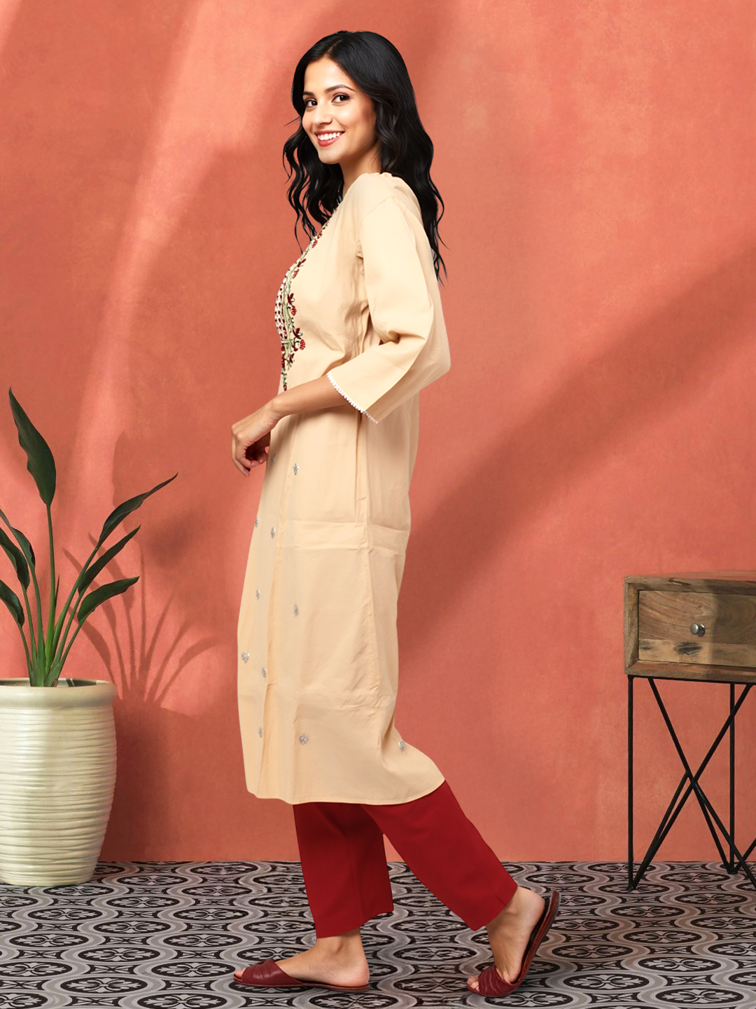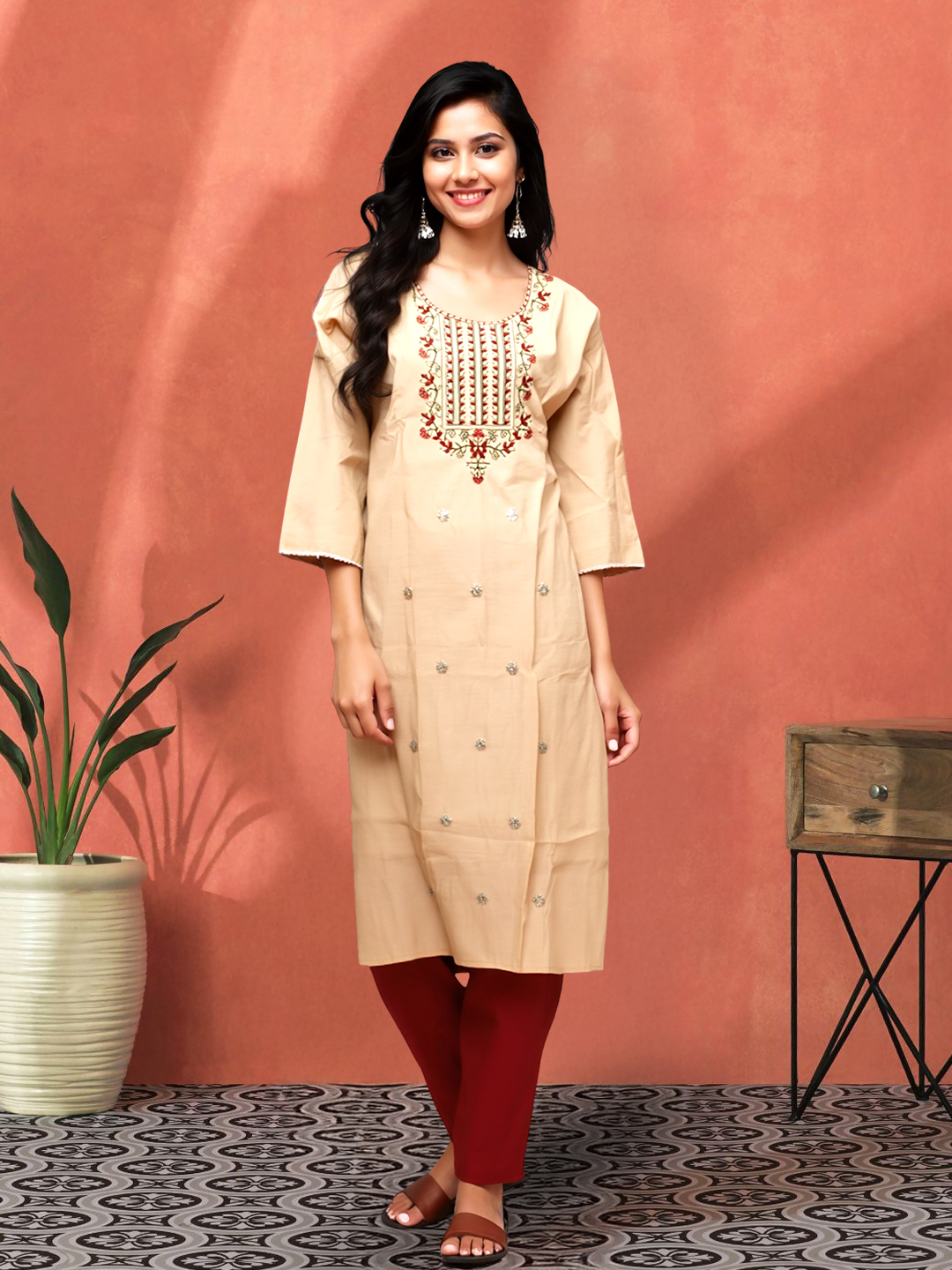 The straight-cut kurta with three-quarter sleeves offers a perfect blend of style and ease, ideal for all-day wear.