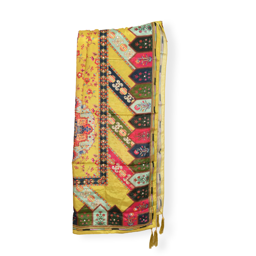 The multi-color printed dupatta showcases classic motifs and playful border tassels, bringing vibrancy and movement to your ensemble.