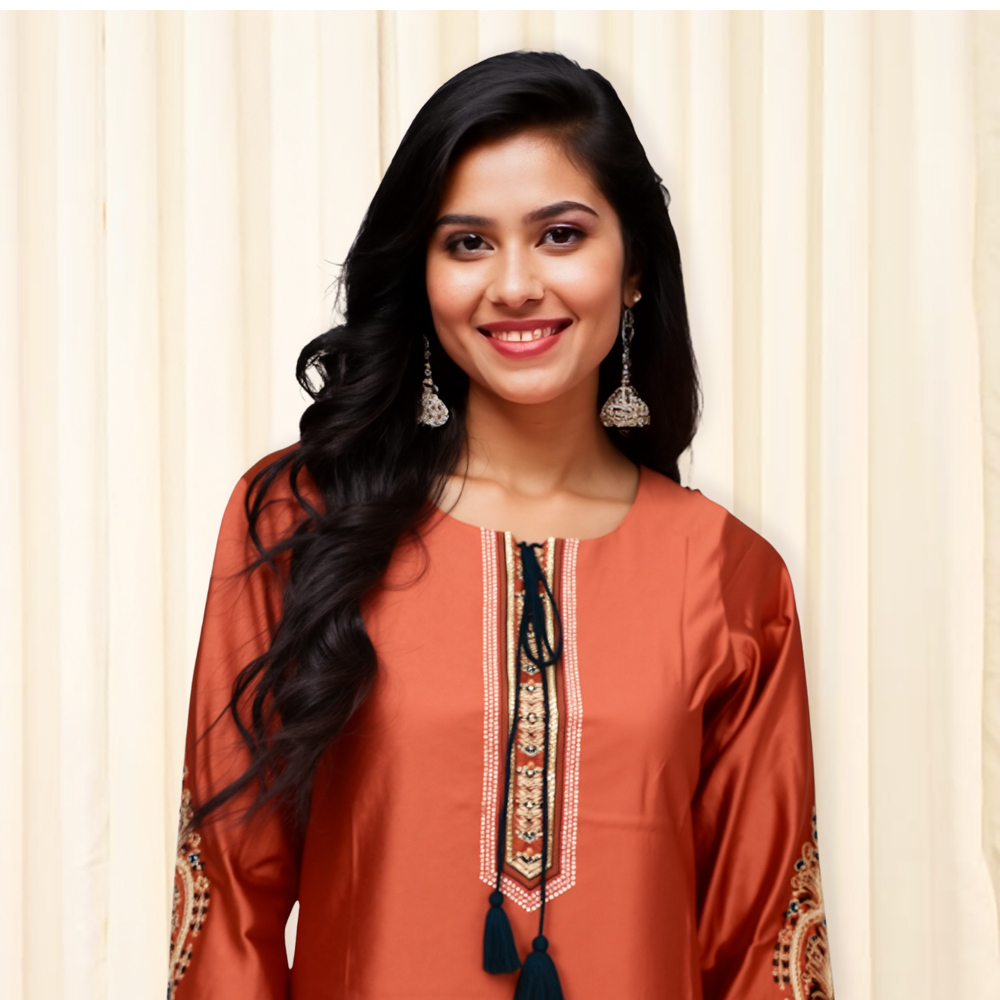 The round neckline adds a touch of classic style while ensuring comfort. Not too high, not too low—this neckline is universally flattering and works well for both casual and formal looks. Whether worn with a dupatta or on its own, the design highlights the beauty of the embroidery and the simplicity of the kurta’s silhouette.