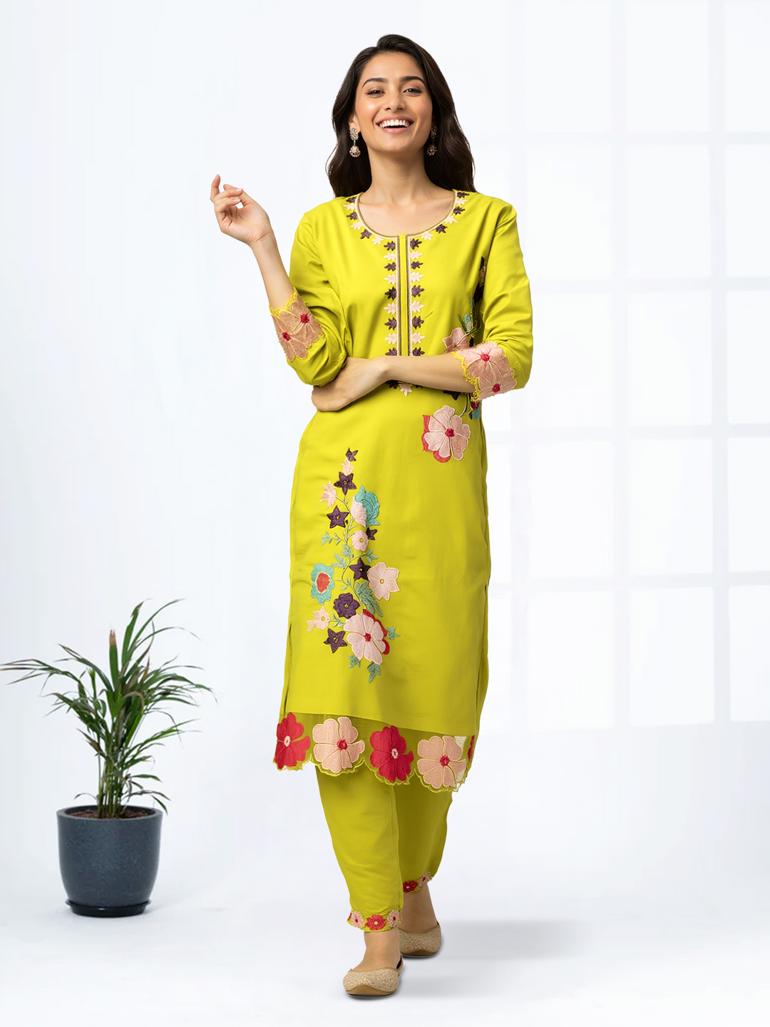 From 3D floral appliqués on the dupatta to embroidered ankle motifs on the pants, every element of this set is thoughtfully adorned. It’s florals done right — subtle, sophisticated, and statement-making.
