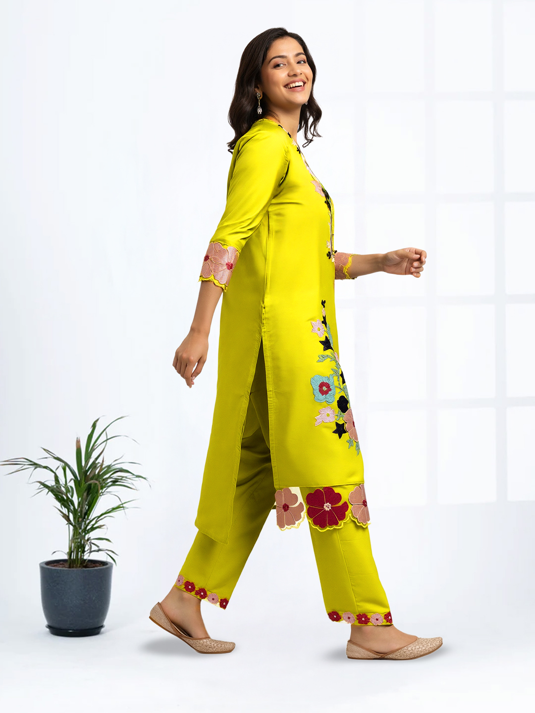 Turn heads with a kurta that tells a story — featuring a cascade of intricate floral embroidery from shoulder to hem. This ensemble captures timeless elegance with modern charm, perfect for festive gatherings or intimate celebrations.