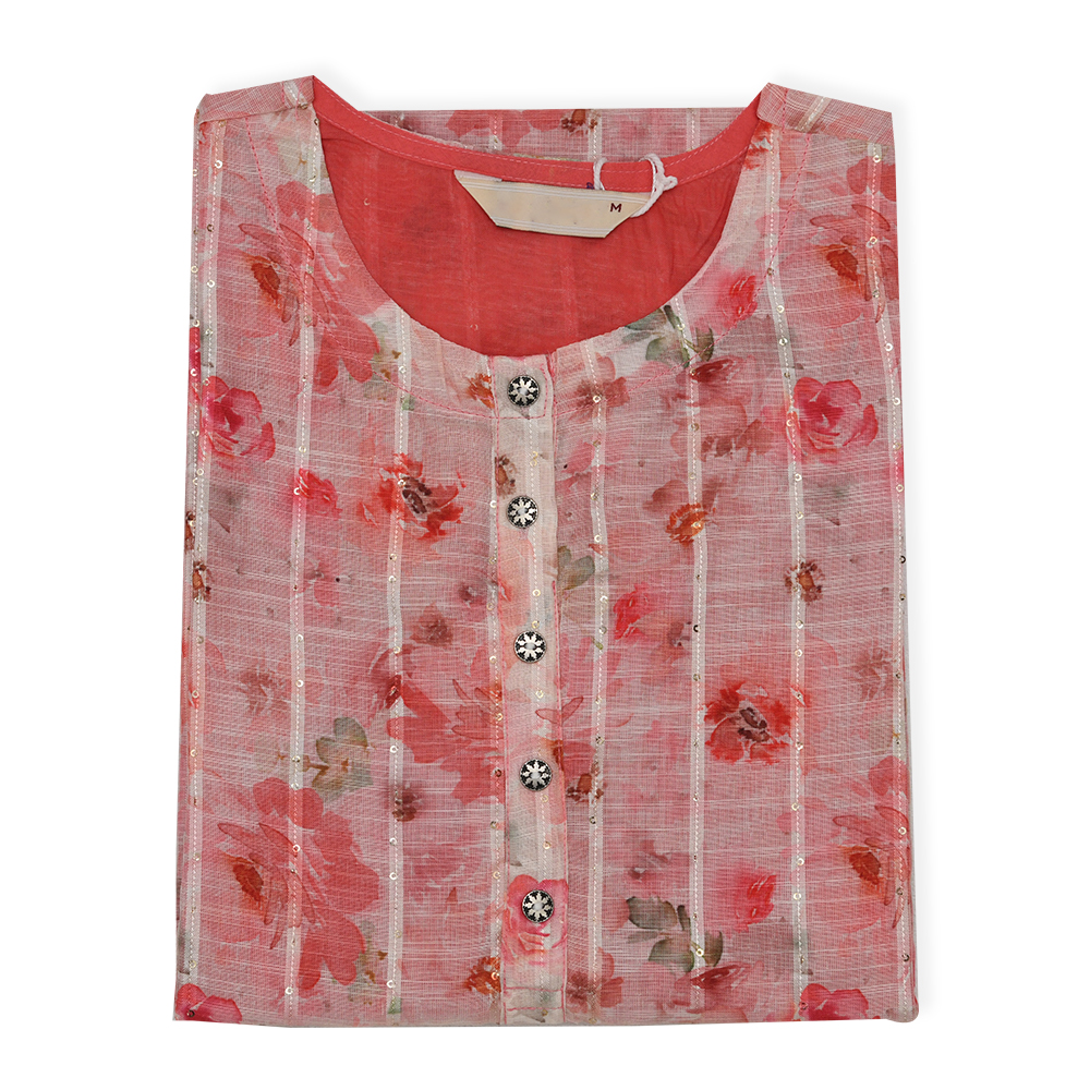 This kurta beautifully blends a sharp, straight silhouette with soft digital florals and a textured stripe backdrop. Elbow-length sleeves and a clean-finished back complete this effortless piece—ideal for desk-to-dinner dressing.