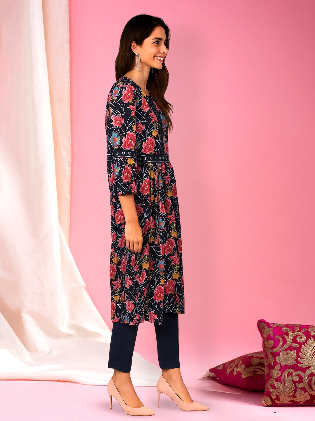 The elegant 3/4 bell sleeves with delicate contrast lace detailing add a feminine touch that beautifully balances tradition with trend.