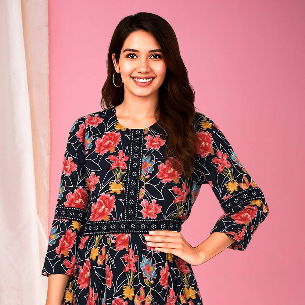 Adorn yourself with the vibrant charm of the all-over multicolor floral print that brings life and color to your wardrobe. Perfect for sunny days and festive occasions alike!