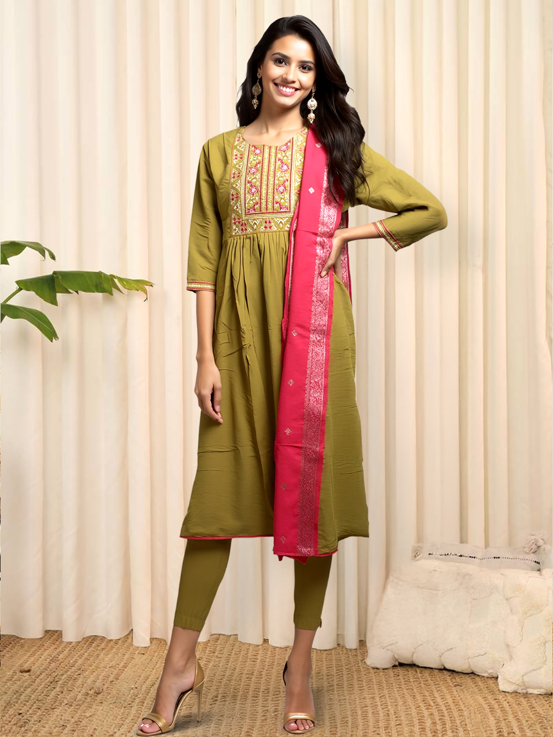 Designed with 3/4th sleeves and delicate embroidered edging, this ensemble blends grace with detail, making it perfect for both traditional and modern festivities.