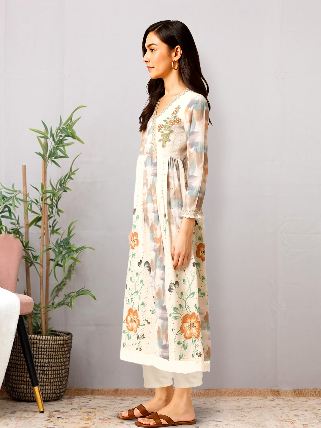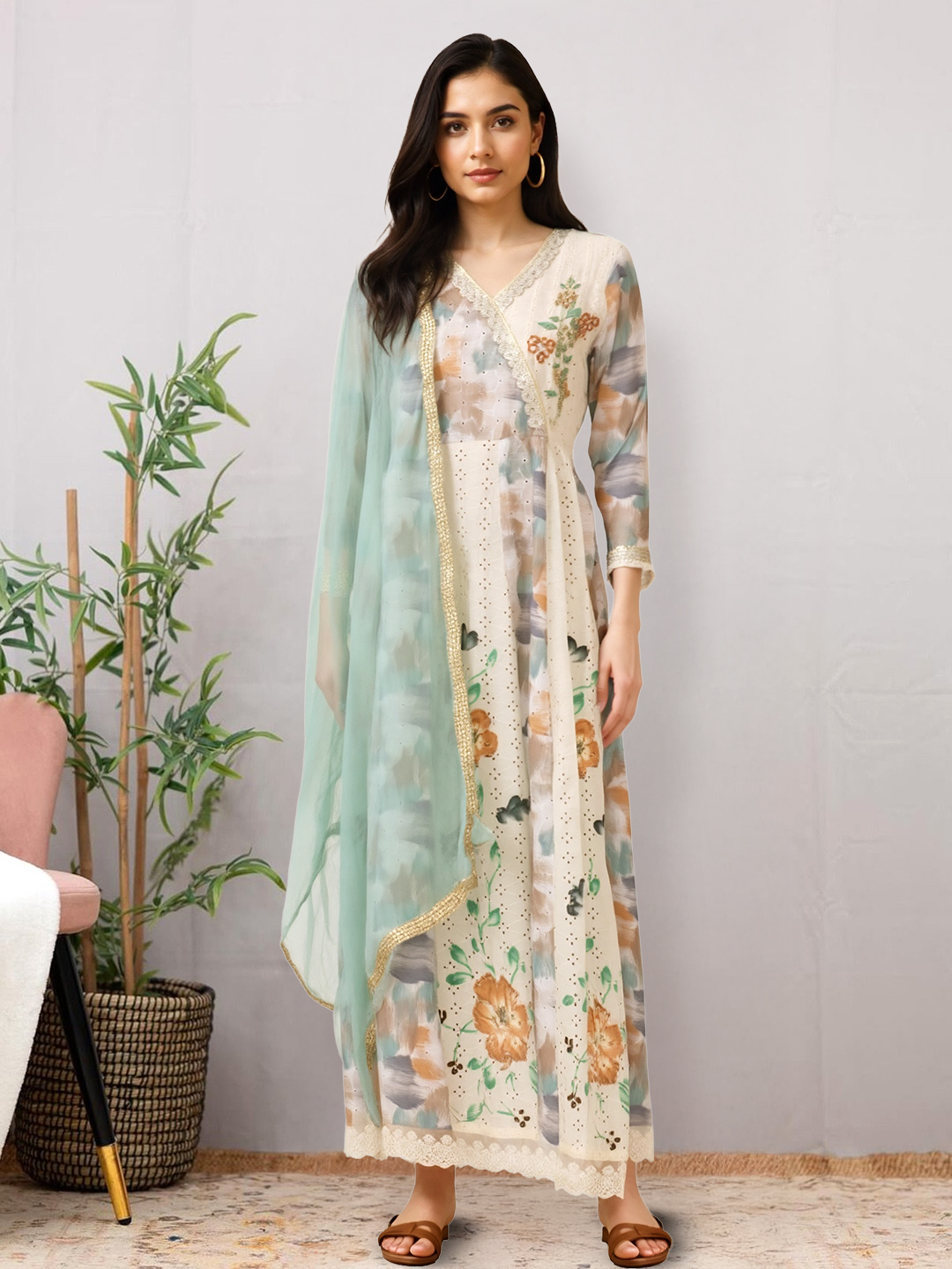 Adorned with colorful floral embroidery, this Anarkali suit set exudes vibrant charm and effortless elegance, perfect for daytime gatherings or evening festivities.