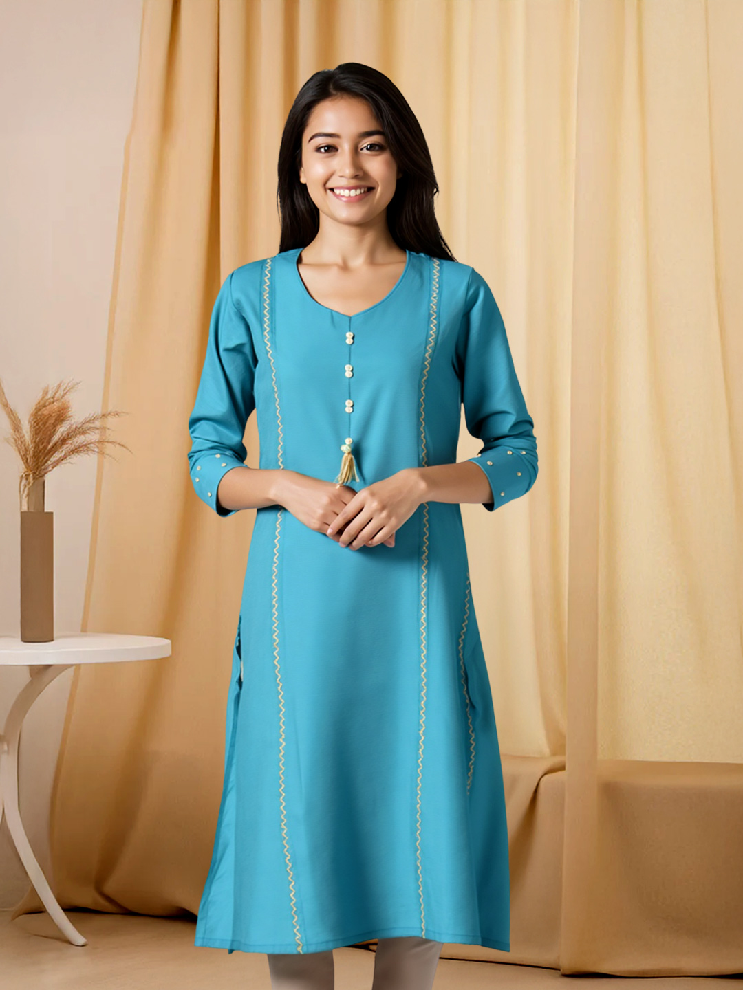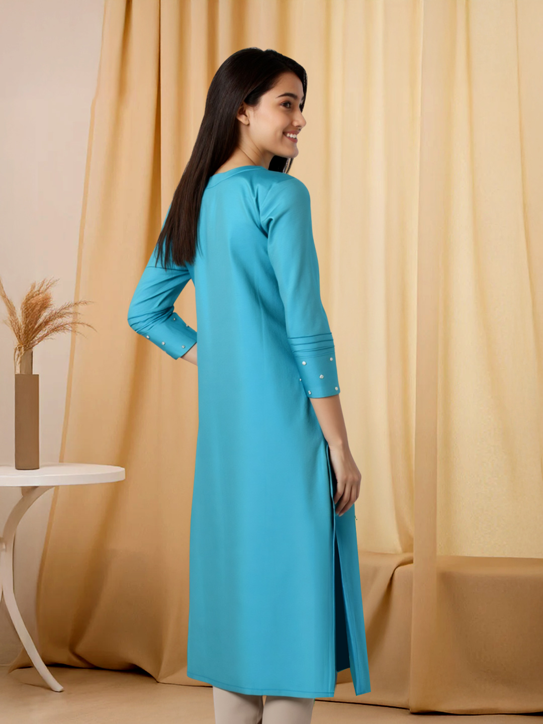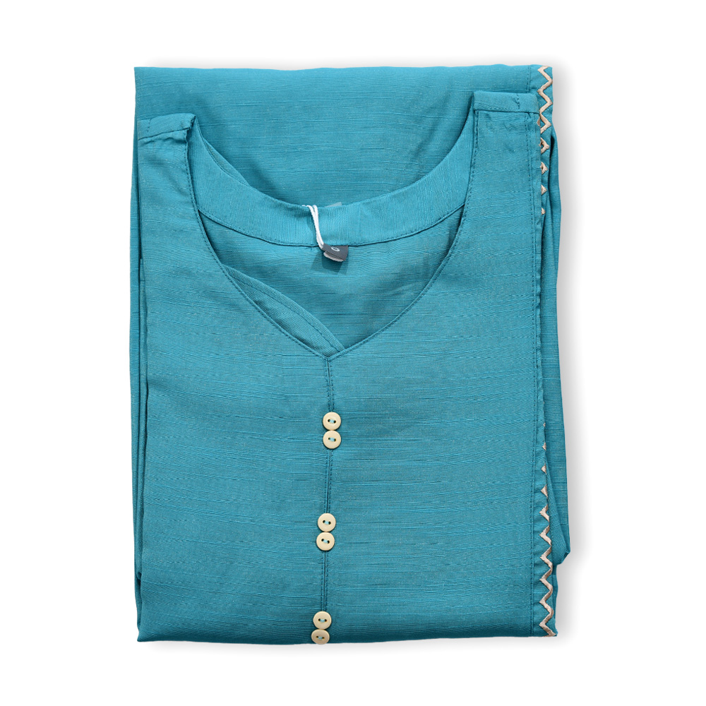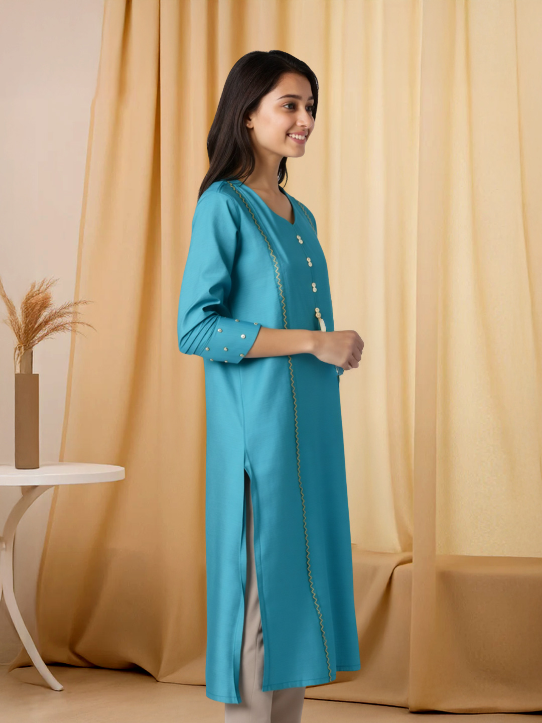 This Soft V-Neck Embroidered Kurta is more than just a pretty piece—it's a versatile addition to your wardrobe. The V-neck with button details and 3/4 sleeves make it perfect for both daytime errands and evening gatherings. Add a little sparkle with your accessories, and you're all set for any occasion.