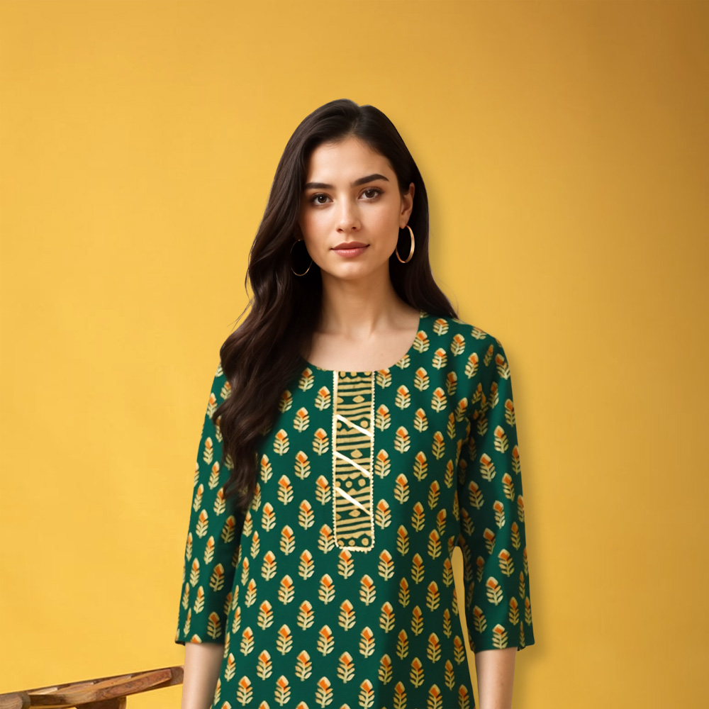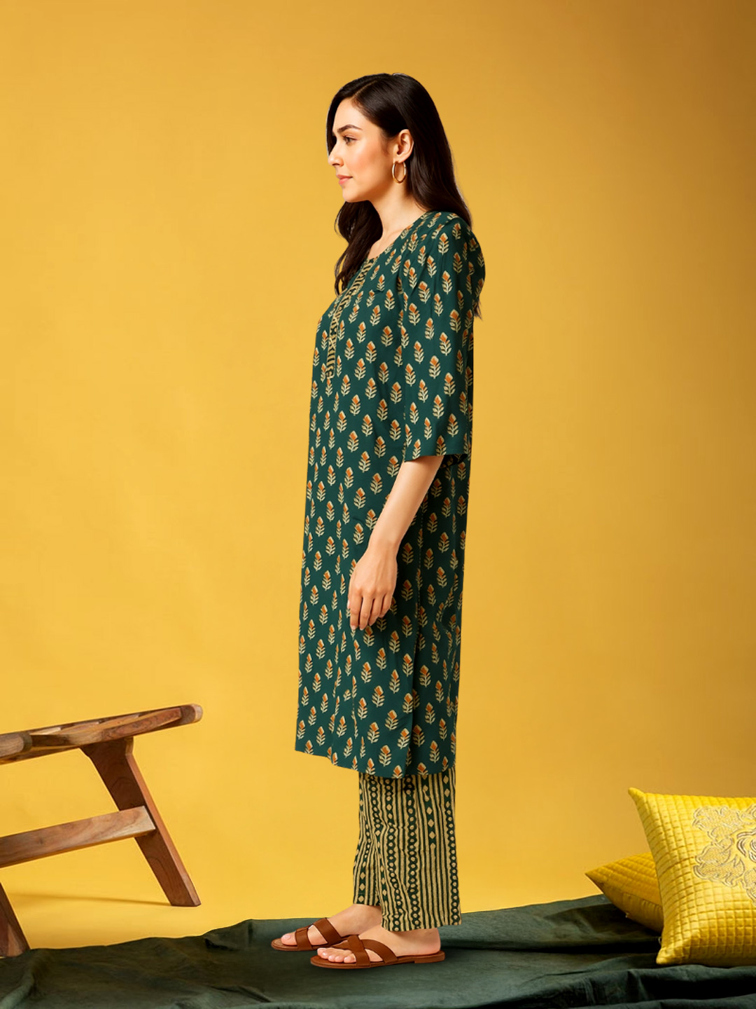 Designed with a straight cut, three-quarter sleeves, and side slits, this kurta offers freedom of movement without compromising style.