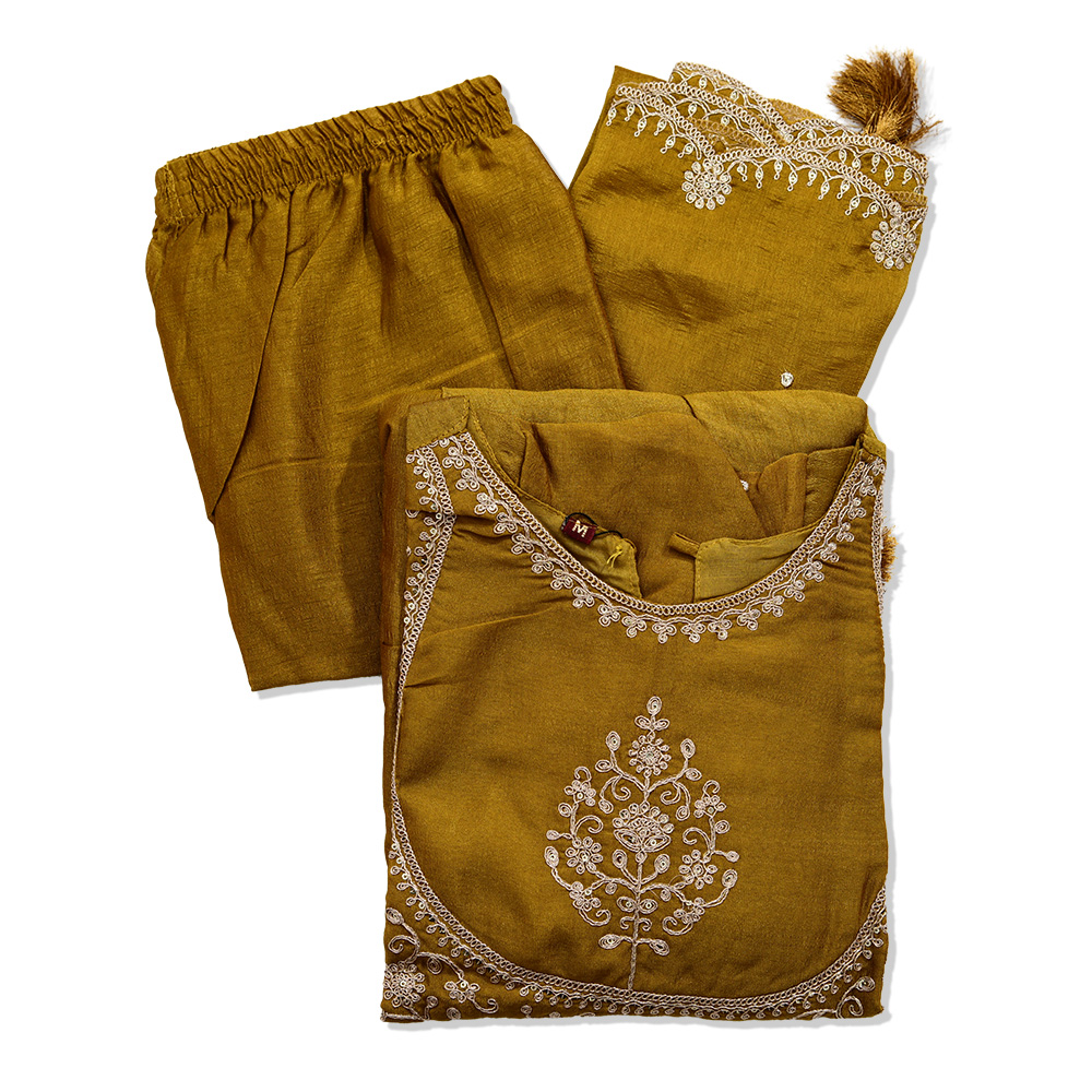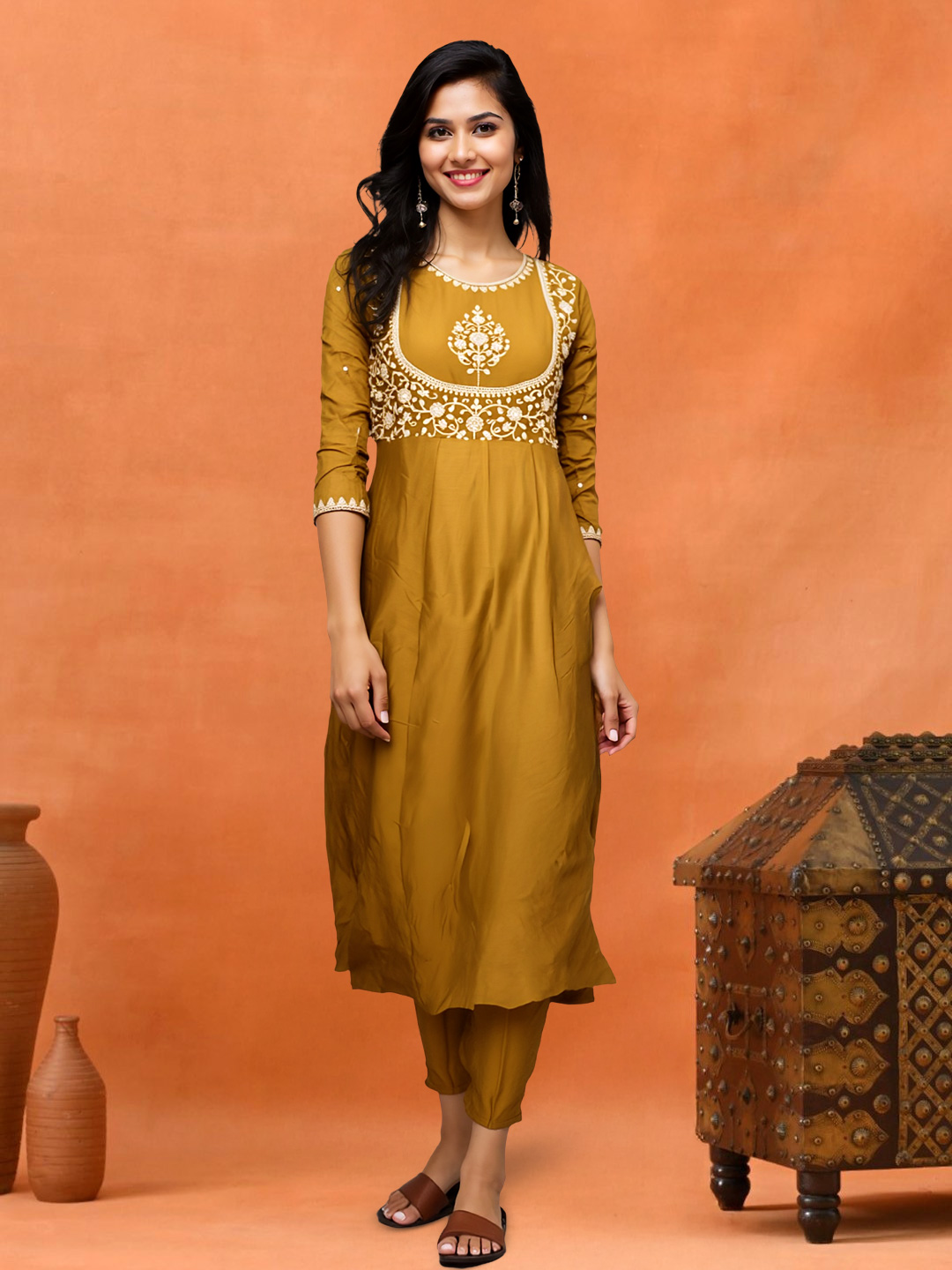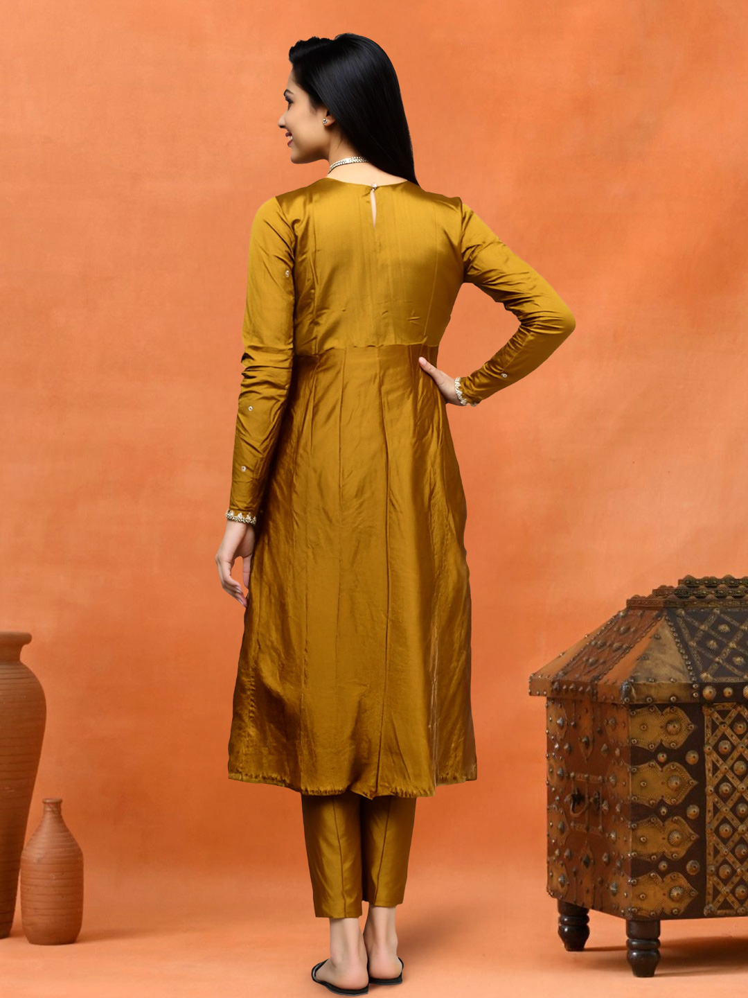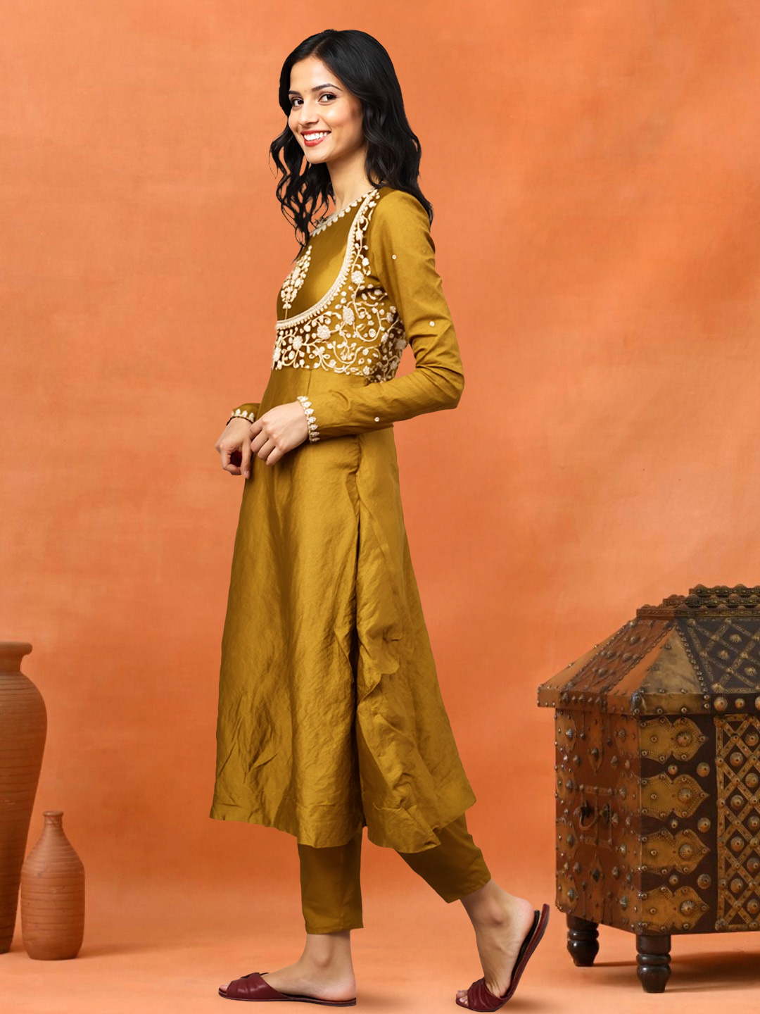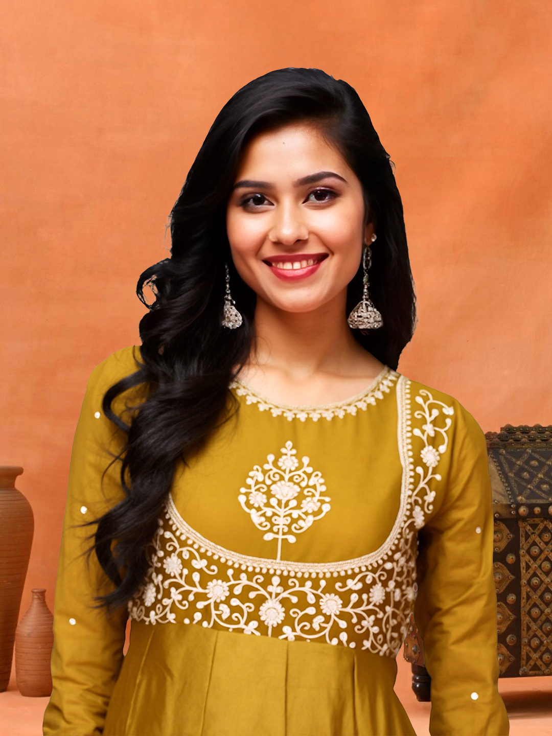 The rich mustard gold hue brings a warm, royal vibe to this Anarkali set, making it perfect for festive celebrations and weddings. The color flatters all skin tones and adds a touch of opulence to your ethnic wardrobe. Combined with the natural sheen of the silk blend fabric, this outfit radiates understated luxury.