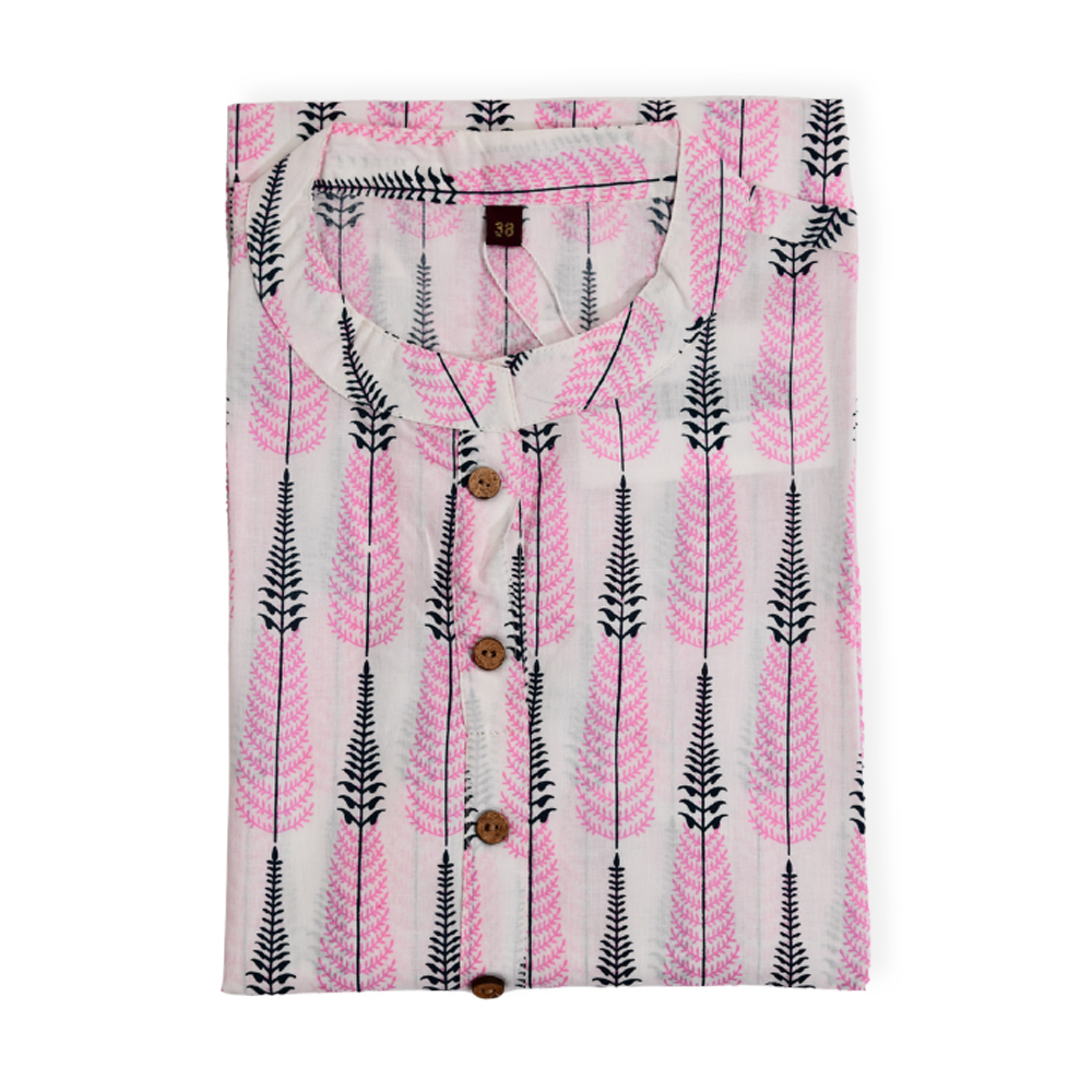 Elevate your everyday style with this trendy printed kurta, featuring a classic buttoned high round neckline that adds a touch of vintage charm. The comfortable fit and elbow-length sleeves make it a versatile choice for work, casual outings, or relaxed weekends.