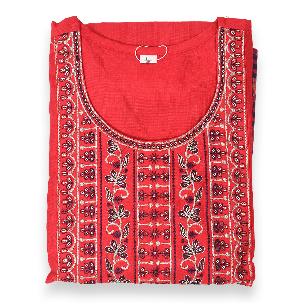 The kurta is adorned with vibrant embroidery along the neckline, featuring a stunning design in rich, lively hues. This detailed artwork adds a playful yet refined touch, making it a standout piece in your wardrobe.