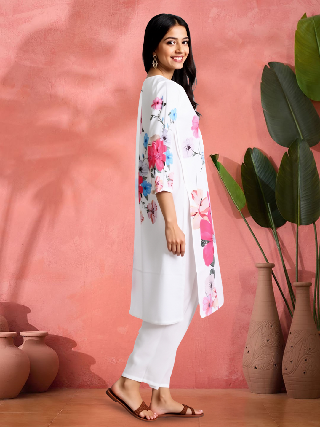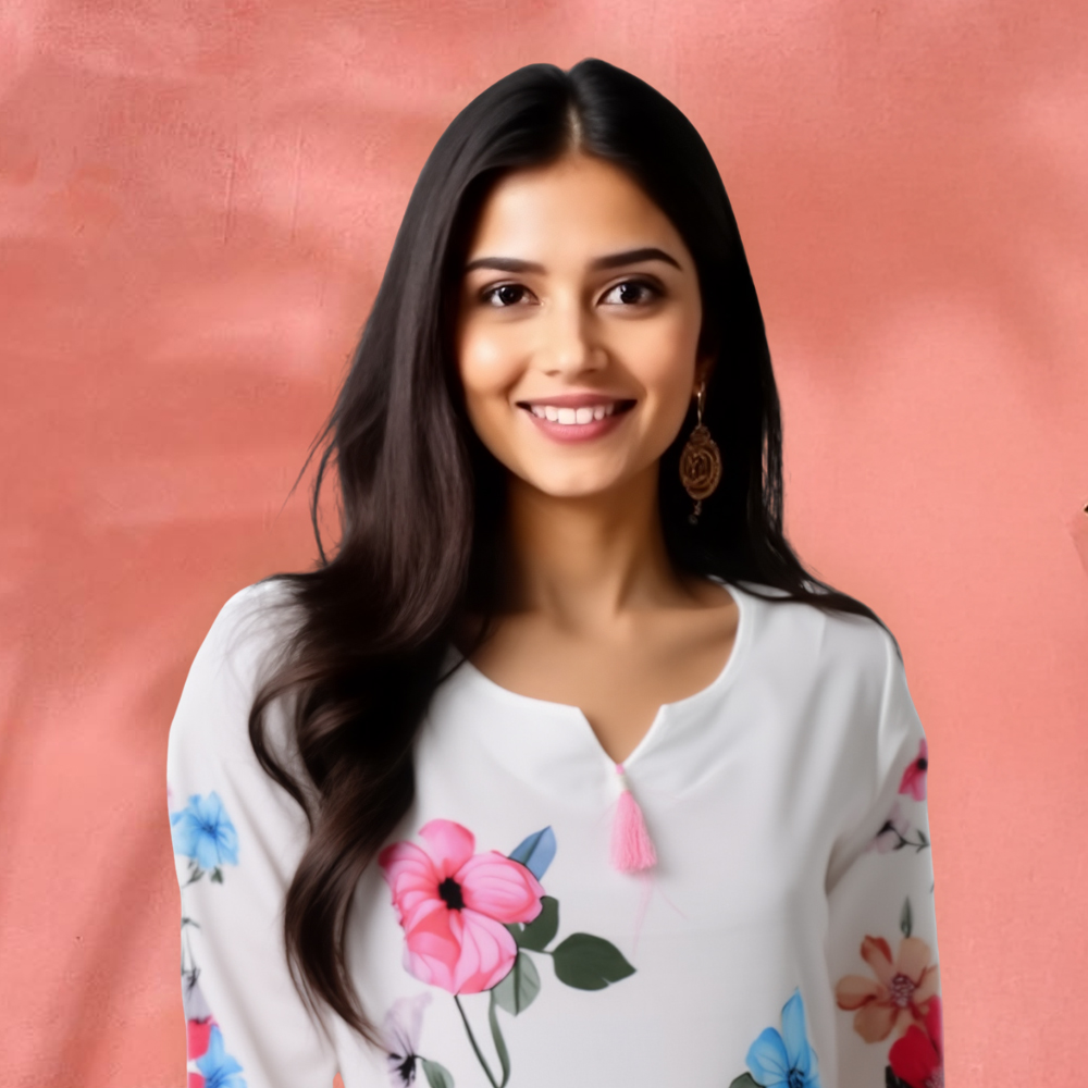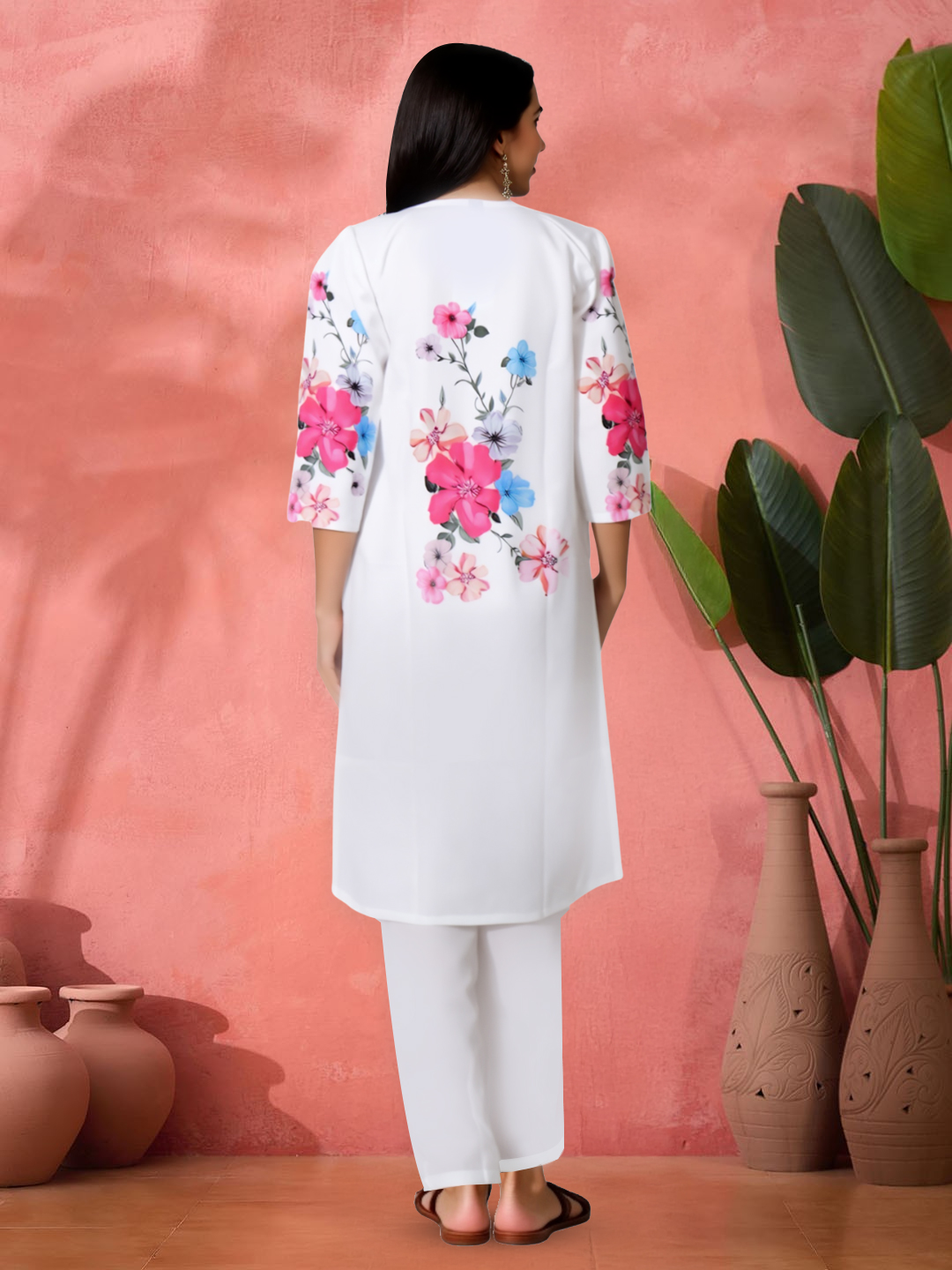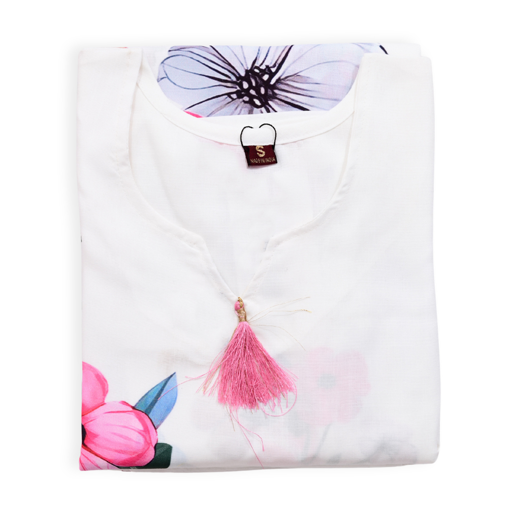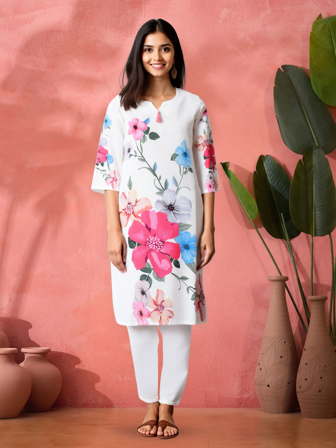 The three-quarter sleeves aren’t just practical—they’re a perfect match to the vibrant floral prints that adorn the kurta. These matching patterns offer a seamless, cohesive look from head to toe, creating a harmonious balance between comfort and style. They add a playful yet refined touch to the outfit.